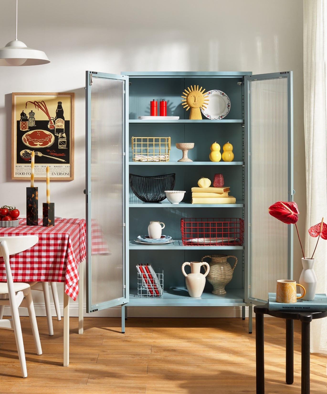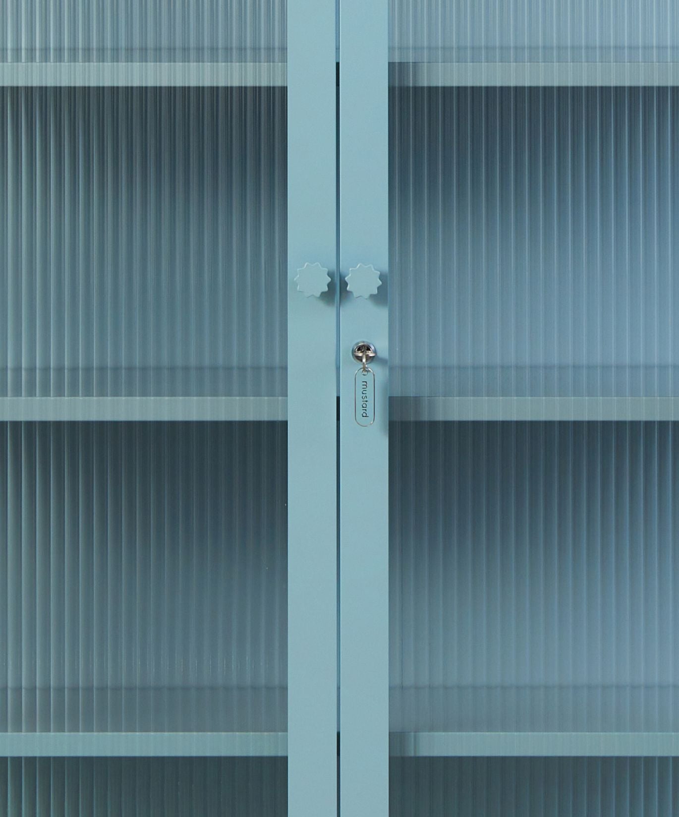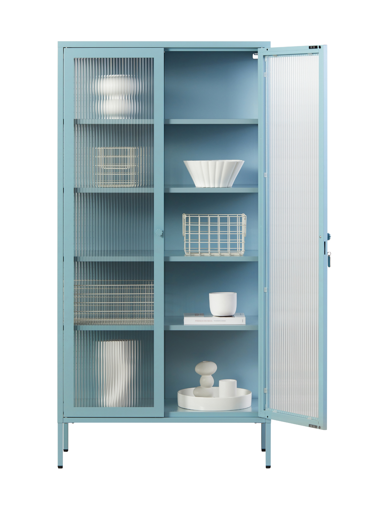 Im Inneren befinden sich vier verstellbare Einlegeböden, ein Türriegel und eine dezente Senf-Prägung, die darauf hinweist, dass es sich um einen echten Schrank handelt. Die Außenseite besteht aus geriffelten Glasscheiben in einem Metallrahmen mit Medaillongriffen, einem Schloss, einem Schlüsselring aus Mustard und verstellbaren Füßen. Unsere Farben kommen auf Bildschirmen nicht immer gut zur Geltung - bestellen Sie ein Muster, um zu sehen, wie es in Ihrem Raum aussieht.