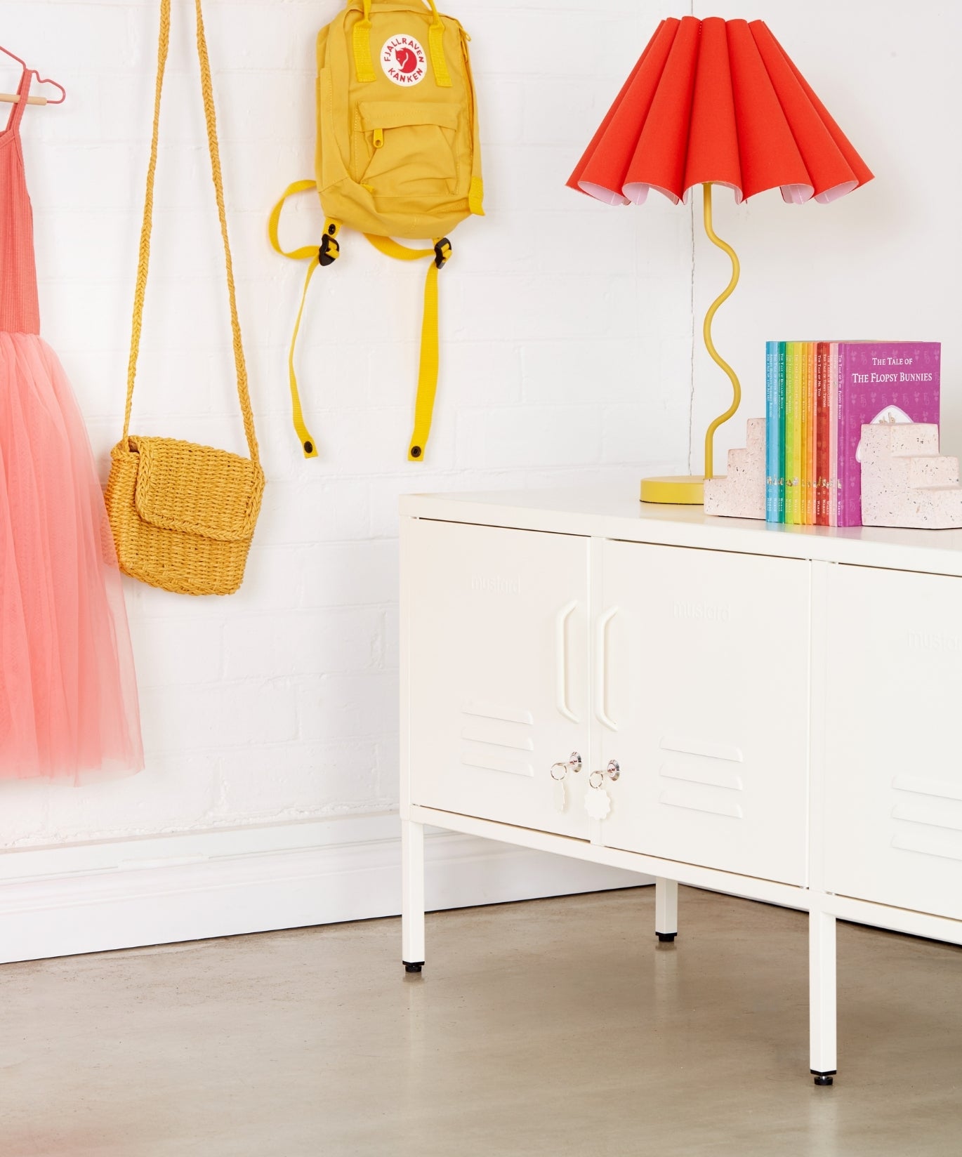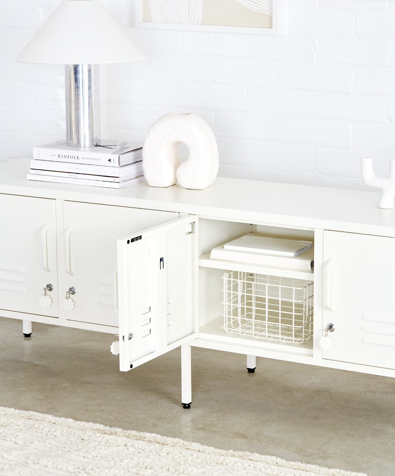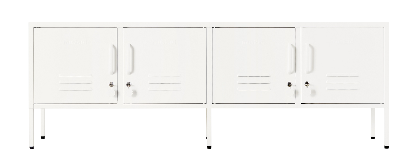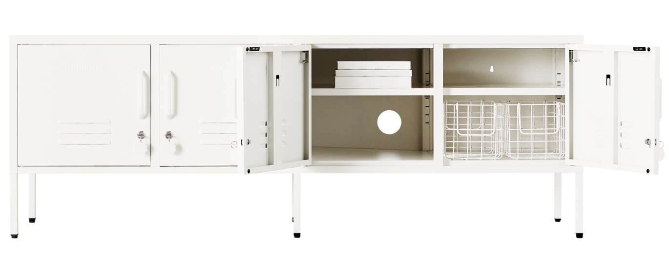 Im Inneren finden Sie vier verstellbare Einlegeböden und einen praktischen Haken in jeder Tür. An der Außenseite finden Sie zwei Kabeldurchlässe, zwei Wandbefestigungspunkte, vier abschließbare Türen, individuelle Schlüsselringe, Lüftungsschlitze und eine dezente Senfprägung auf jeder Tür, damit Sie wissen, dass es sich um einen echten Schrank handelt. Außerdem ist der gesamte Schrank glatt, matt und magnetisch! Unsere Farben kommen auf Bildschirmen nicht immer gut zur Geltung - bestellen Sie ein Muster, um zu sehen, wie es in Ihrem Raum aussieht.