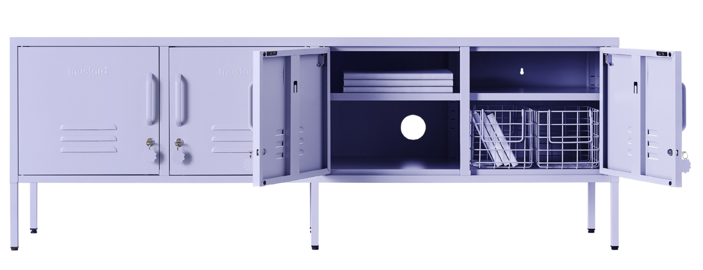 En el interior, encontrarás cuatro estantes ajustables y un práctico gancho dentro de cada puerta. En el exterior, encontrarás dos orificios para cables, dos puntos de fijación a la pared, cuatro puertas con cerradura, llaveros personalizados, rejillas de ventilación y un sutil "mostaza" en relieve en cada puerta, para que sepas que es de verdad. Además, toda la taquilla es lisa, mate e imantada. Las pantallas no siempre hacen justicia a nuestros colores. Pida una muestra para ver cómo queda en su espacio.