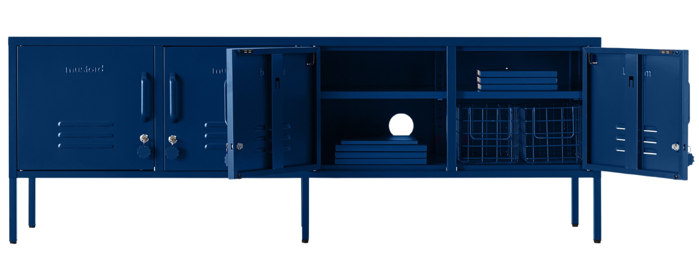 En el interior, encontrarás cuatro estantes ajustables y un práctico gancho dentro de cada puerta. En el exterior, encontrarás dos orificios para cables, dos puntos de fijación a la pared, cuatro puertas con cerradura, llaveros personalizados, rejillas de ventilación y un sutil "mostaza" en relieve en cada puerta, para que sepas que es de verdad. Además, toda la taquilla es lisa, mate e imantada. Las pantallas no siempre hacen justicia a nuestros colores. Pida una muestra para ver cómo queda en su espacio.