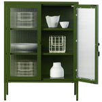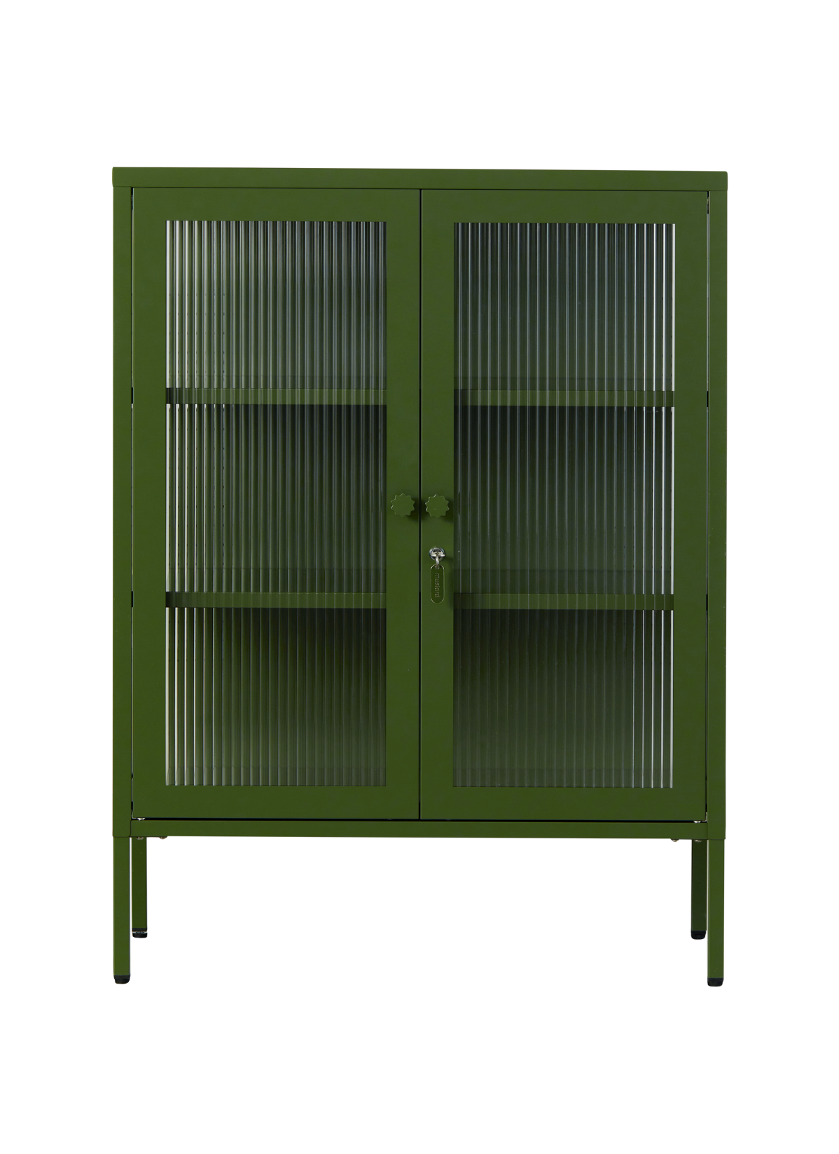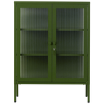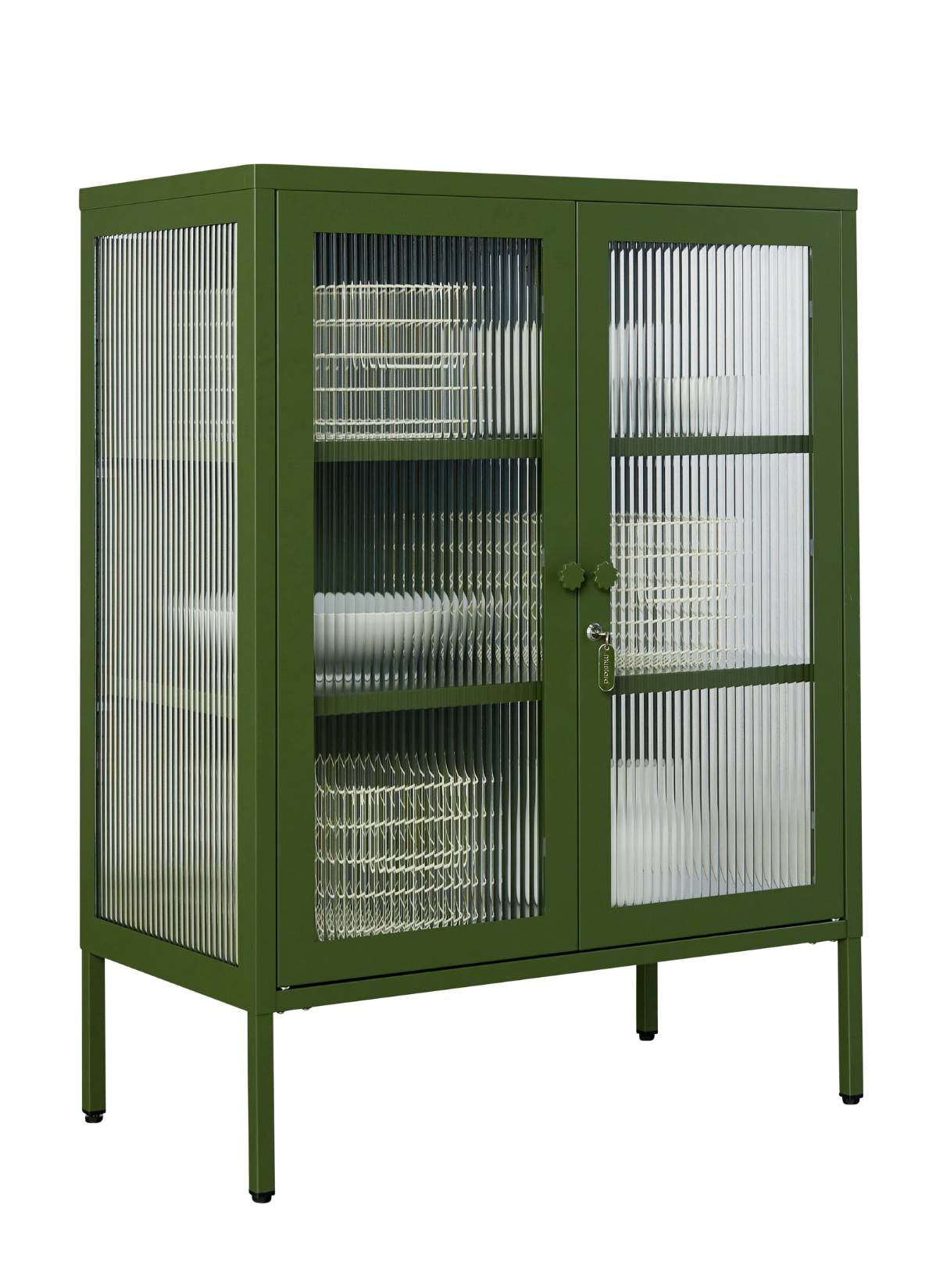 En el interior encontrarás dos estantes ajustables, un cerrojo de puerta y un sutil "mostaza" en relieve, para que sepas que es de verdad. En el exterior, los paneles de cristal estriado están colocados en un marco metálico con asas medallón, una cerradura, un llavero esmaltado Mustard personalizado, patas ajustables y puntos de fijación a la pared. Las pantallas no siempre hacen justicia a nuestros colores: pida una muestra para ver cómo queda en su espacio.