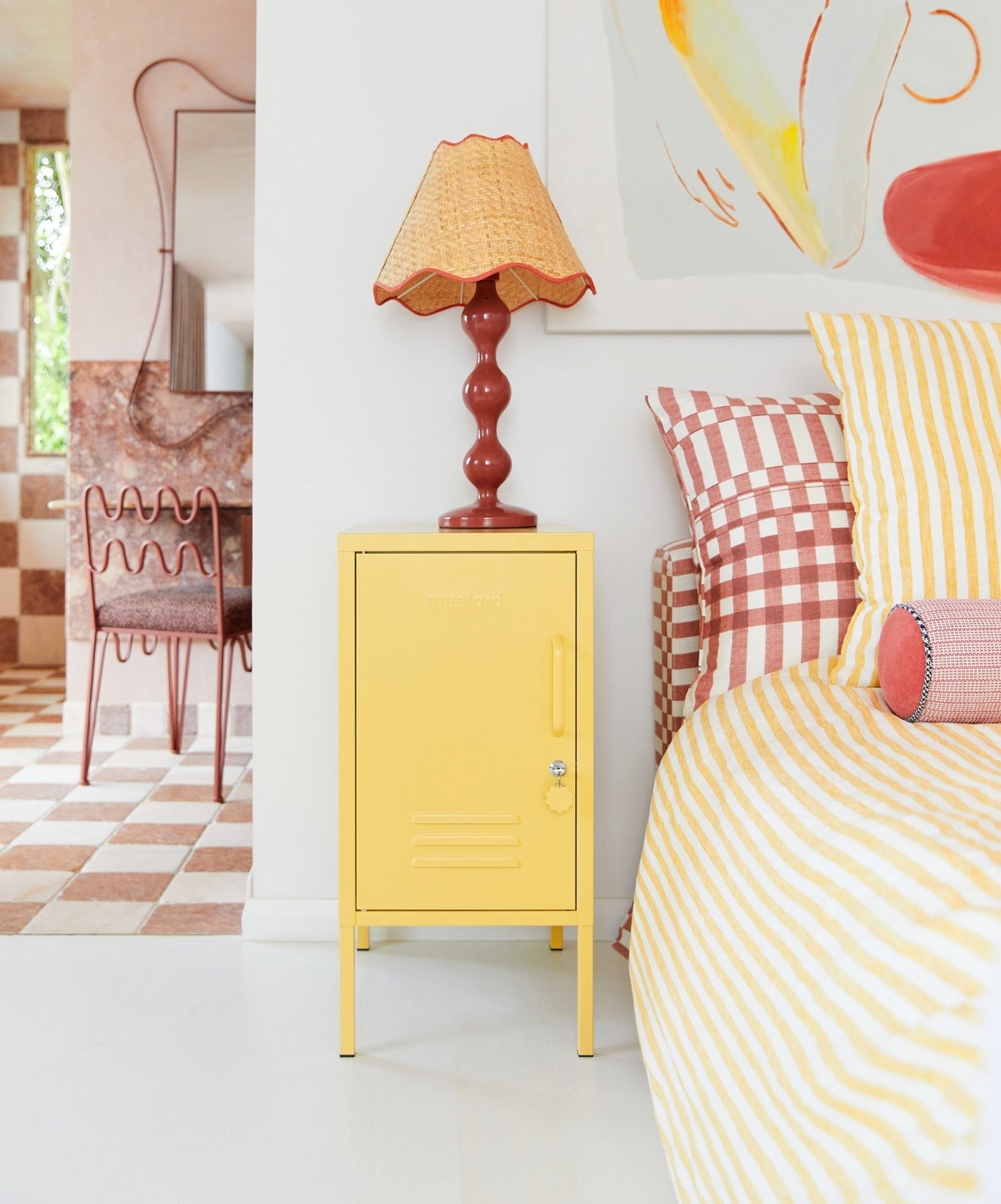 En el interior, hay dos estantes ajustables y un práctico gancho. En el exterior, encontrarás un asa, una cerradura, un llavero personalizado, rejillas de ventilación y un sutil "mostaza" en relieve, para que sepas que es de verdad. La puerta se abre hacia la izquierda. Además, toda la taquilla es lisa, mate y magnética. Las pantallas no siempre hacen justicia a nuestros colores. Pida una muestra para ver cómo queda en su espacio.