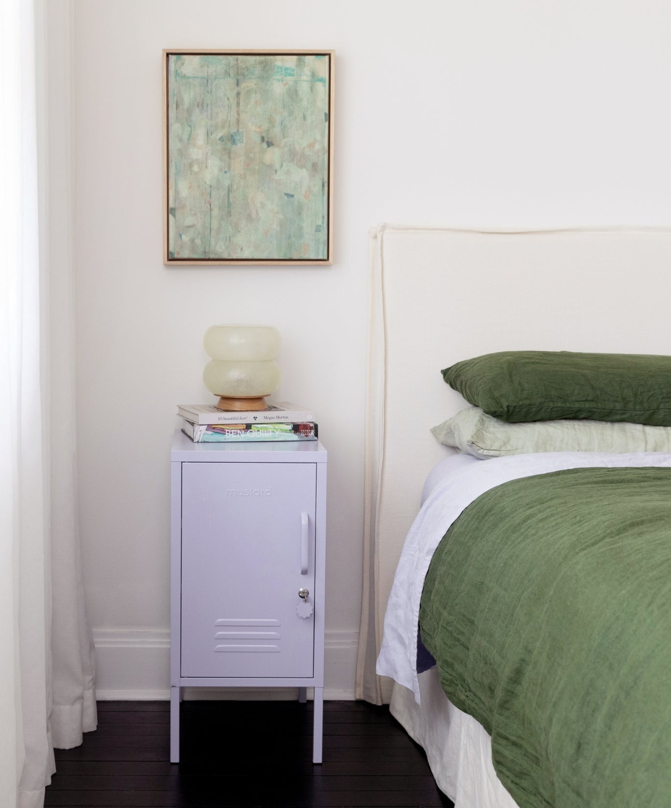 En el interior, hay dos estantes ajustables y un práctico gancho. En el exterior, encontrarás un asa, una cerradura, un llavero personalizado, rejillas de ventilación y un sutil "mostaza" en relieve, para que sepas que es de verdad. La puerta se abre hacia la izquierda. Además, toda la taquilla es lisa, mate y magnética. Las pantallas no siempre hacen justicia a nuestros colores. Pida una muestra para ver cómo queda en su espacio.