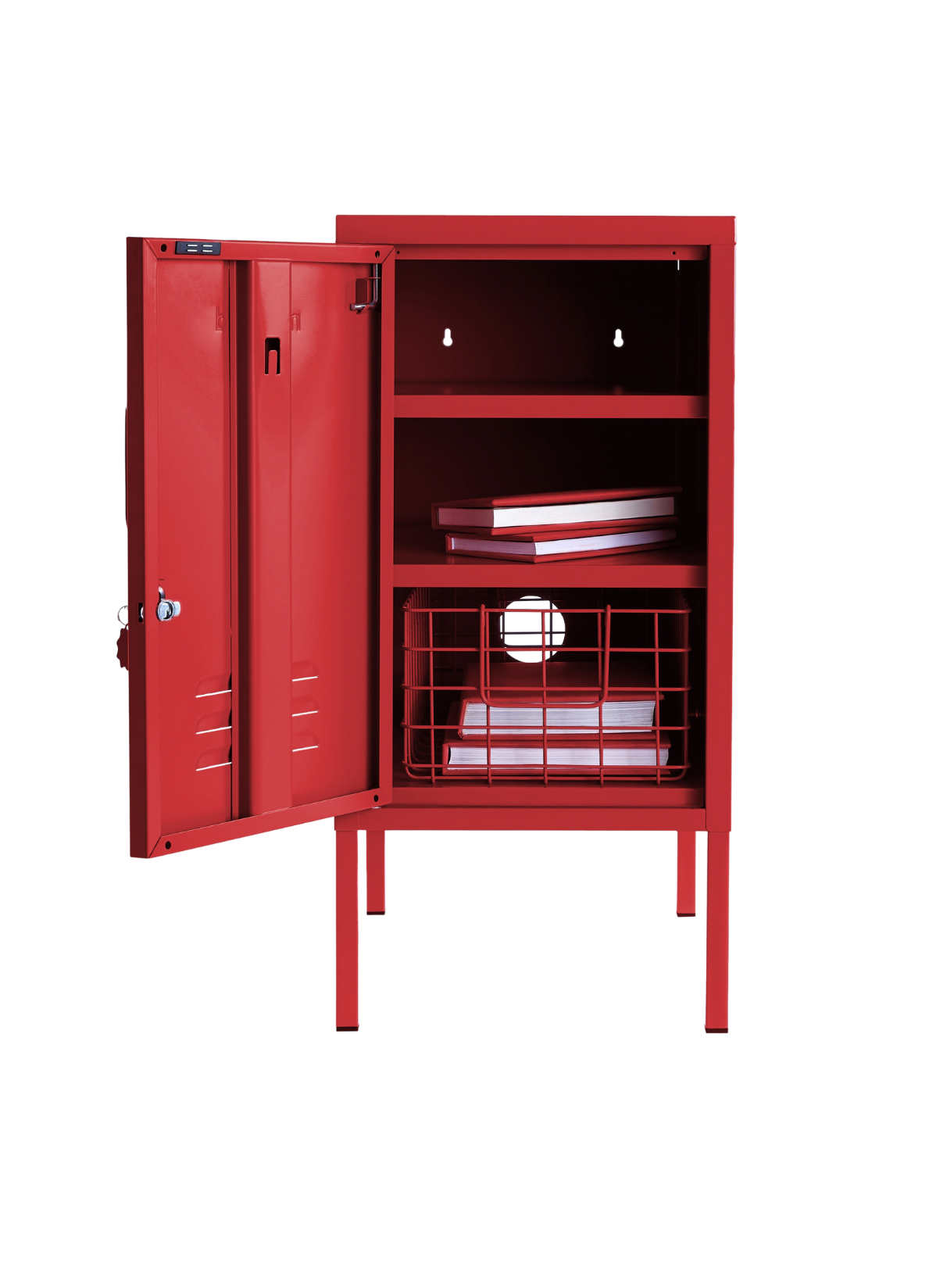 En el interior, hay dos estantes ajustables y un práctico gancho. En el exterior, encontrarás un asa, una cerradura, un llavero personalizado, rejillas de ventilación y un sutil "mostaza" en relieve, para que sepas que es de verdad. La puerta se abre hacia la izquierda. Además, toda la taquilla es lisa, mate y magnética. Las pantallas no siempre hacen justicia a nuestros colores. Pida una muestra para ver cómo queda en su espacio.