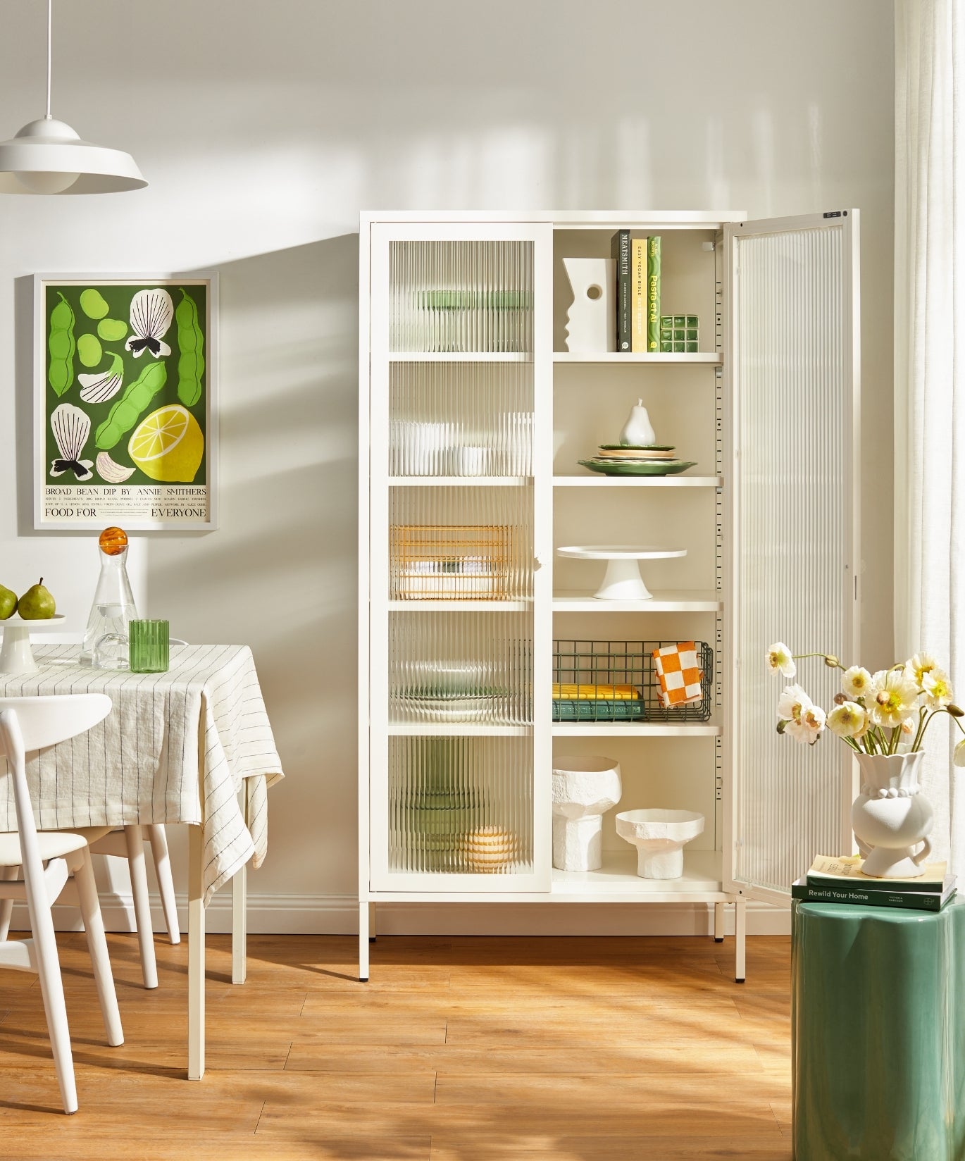 En el interior, encontrarás cuatro estantes ajustables, un cerrojo de puerta y un sutil "mostaza" en relieve, para que sepas que es de verdad. En el exterior, los paneles de cristal estriado están colocados en un marco metálico con asas medallón, una cerradura, un llavero esmaltado Mustard personalizado y patas ajustables. Las pantallas no siempre hacen justicia a nuestros colores: pida una muestra para ver cómo queda en su espacio.