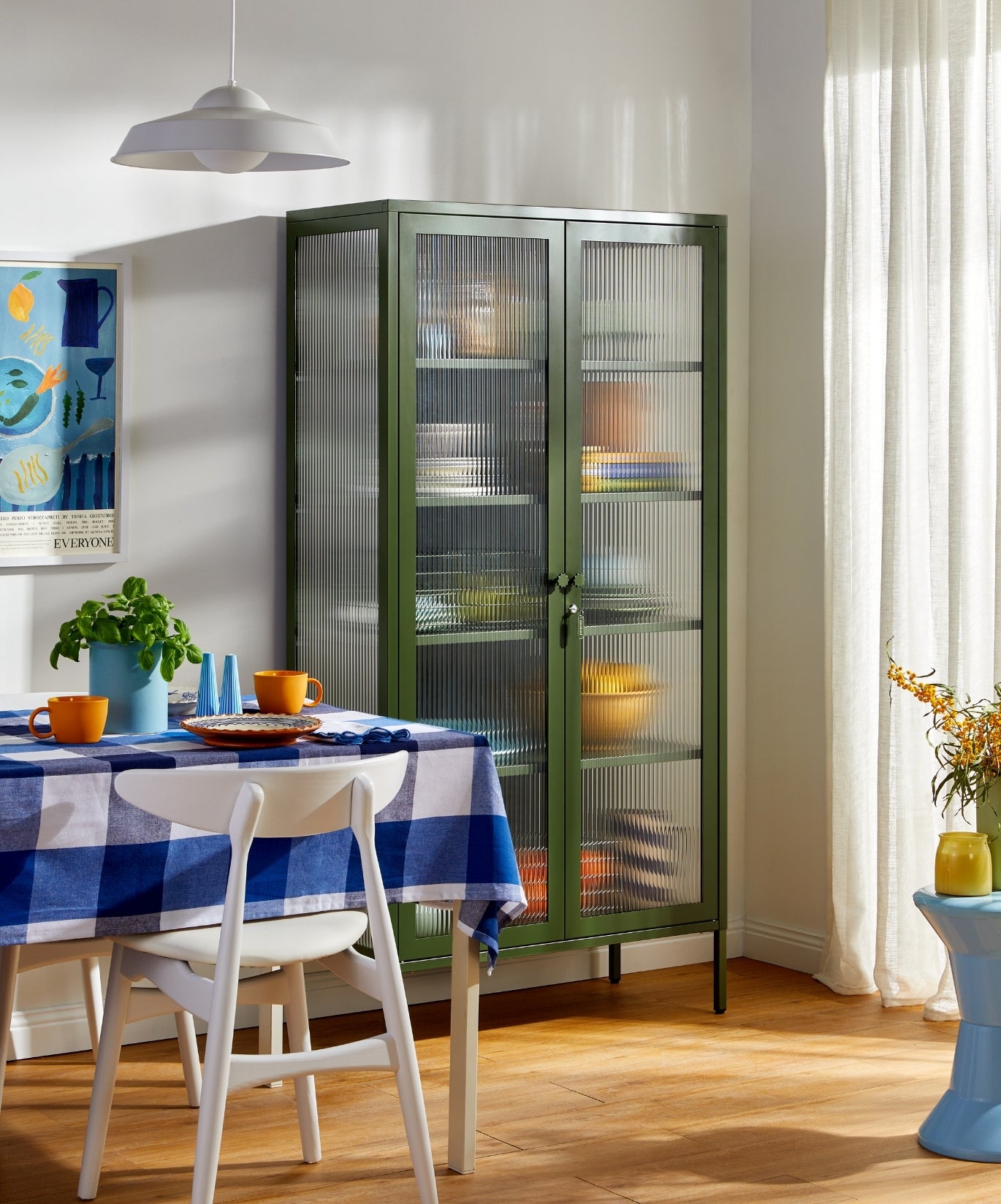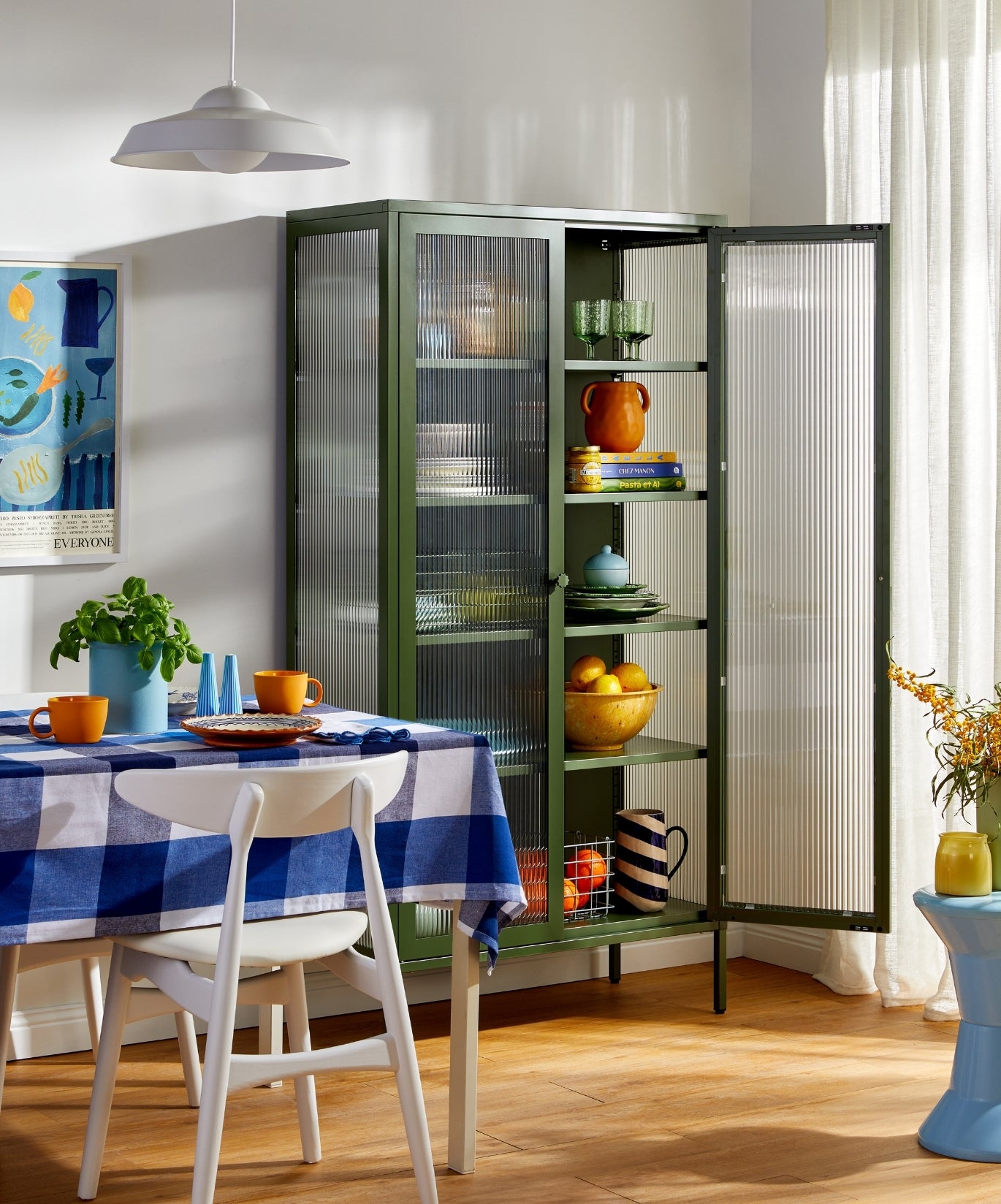 En el interior, encontrarás cuatro estantes ajustables, un cerrojo de puerta y un sutil "mostaza" en relieve, para que sepas que es de verdad. En el exterior, los paneles de cristal estriado están colocados en un marco metálico con asas medallón, una cerradura, un llavero esmaltado Mustard personalizado y patas ajustables. Las pantallas no siempre hacen justicia a nuestros colores: pida una muestra para ver cómo queda en su espacio.