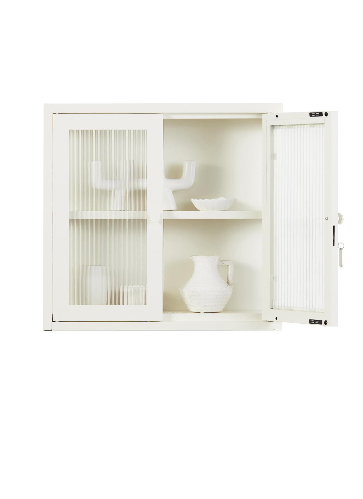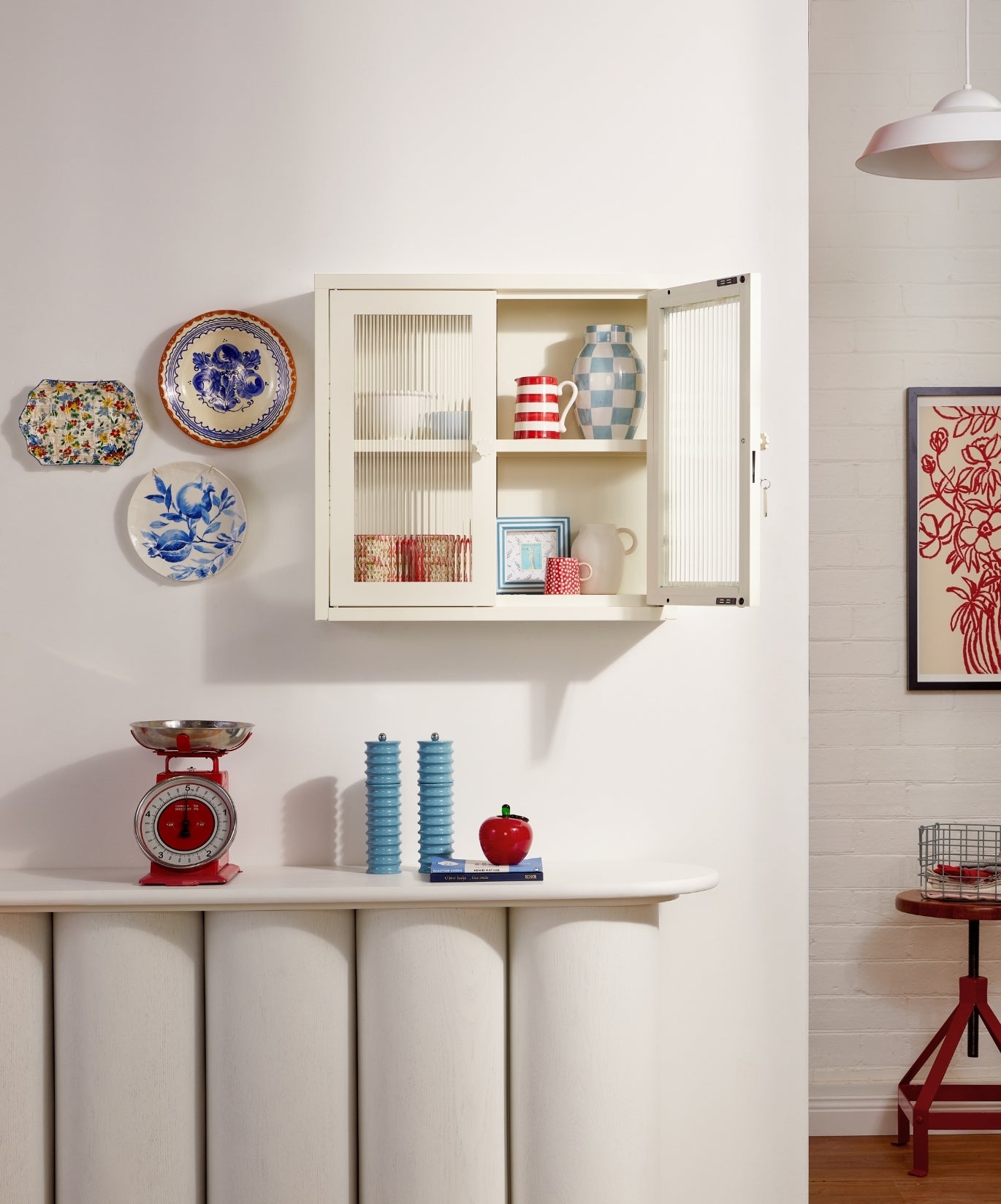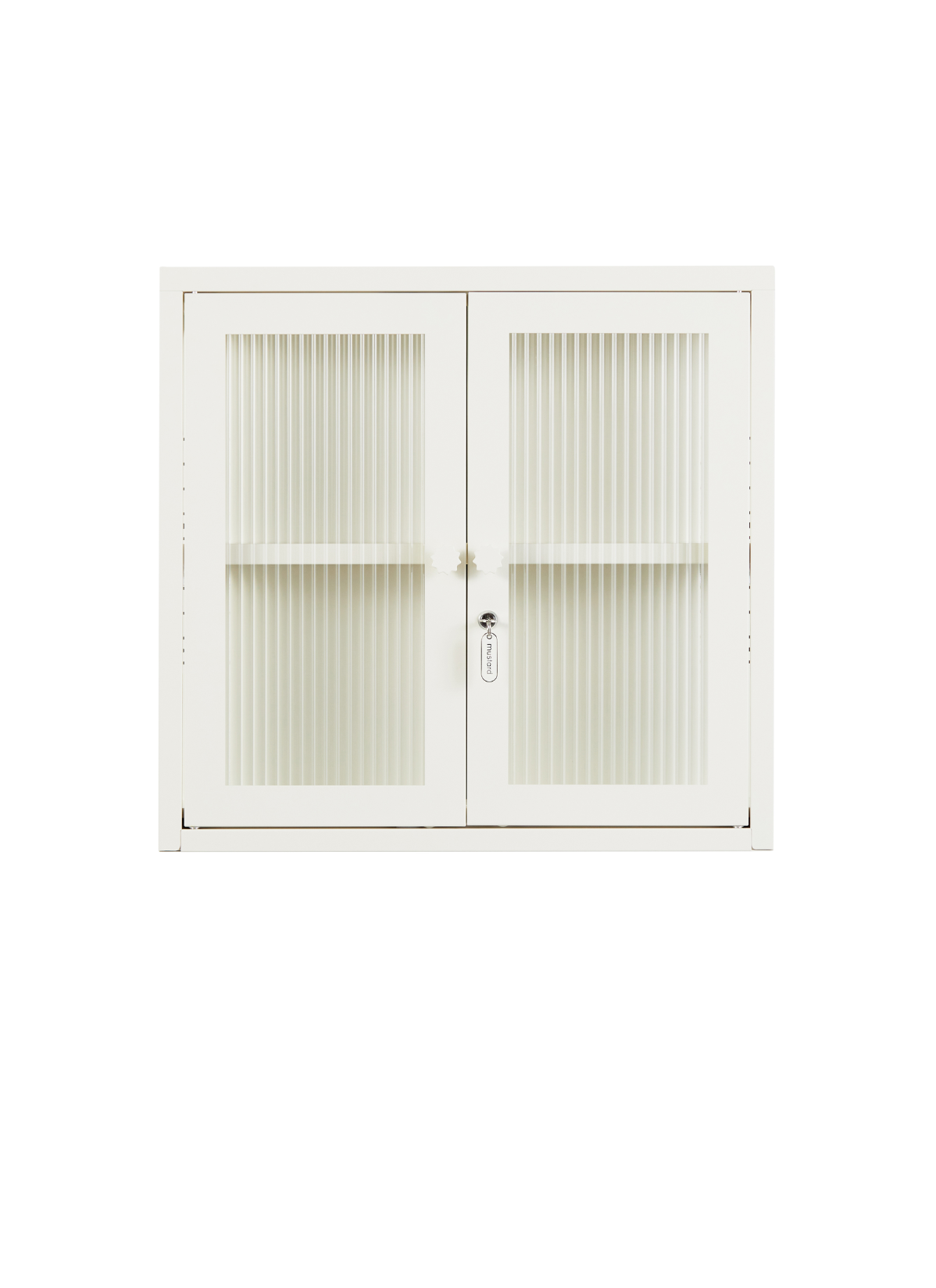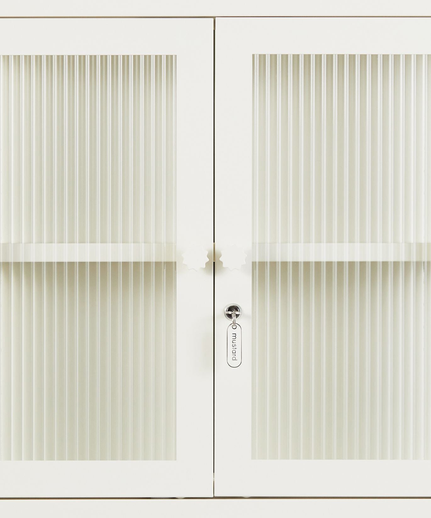 En el interior, encontrarás un estante ajustable, un cerrojo de puerta y un sutil "mostaza" en relieve, para que sepas que es de verdad. En el exterior, los paneles de cristal estriado están colocados en un marco metálico con asas medallón, una cerradura, un llavero esmaltado Mustard personalizado y puntos de fijación a la pared. Las pantallas no siempre hacen justicia a nuestros colores: pida una muestra para ver cómo queda en su espacio.