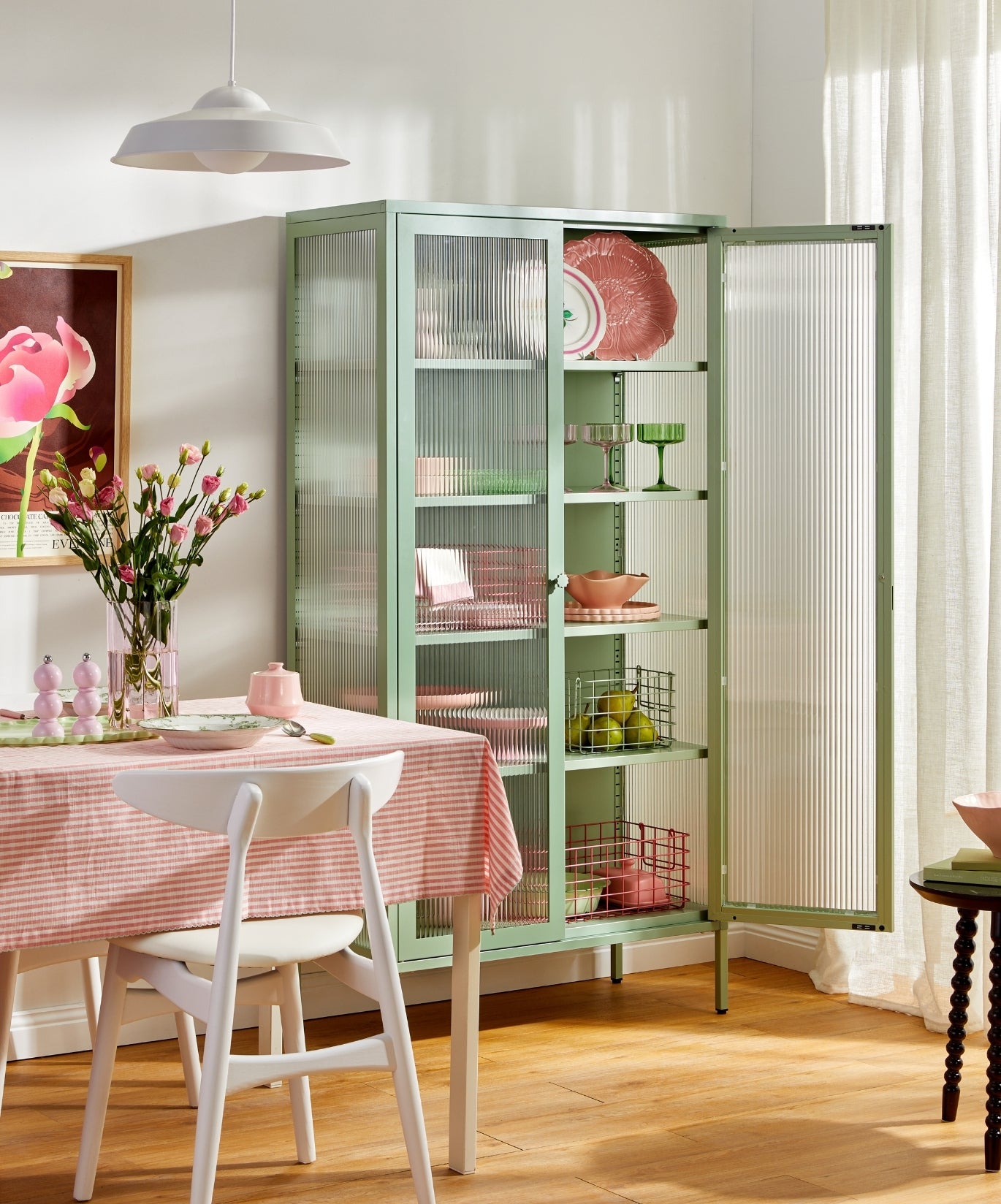 À l'intérieur, vous trouverez quatre étagères réglables, un verrou de porte et un subtil gaufrage "moutarde", pour vous faire comprendre qu'il s'agit d'une véritable affaire. À l'extérieur, des panneaux de verre cannelé sont placés dans un cadre métallique avec des poignées en médaillon, une serrure, un porte-clés personnalisé en émail Mustard et des pieds réglables. Les écrans ne rendent pas toujours justice à nos couleurs - commandez un échantillon pour voir ce que cela donne dans votre espace.