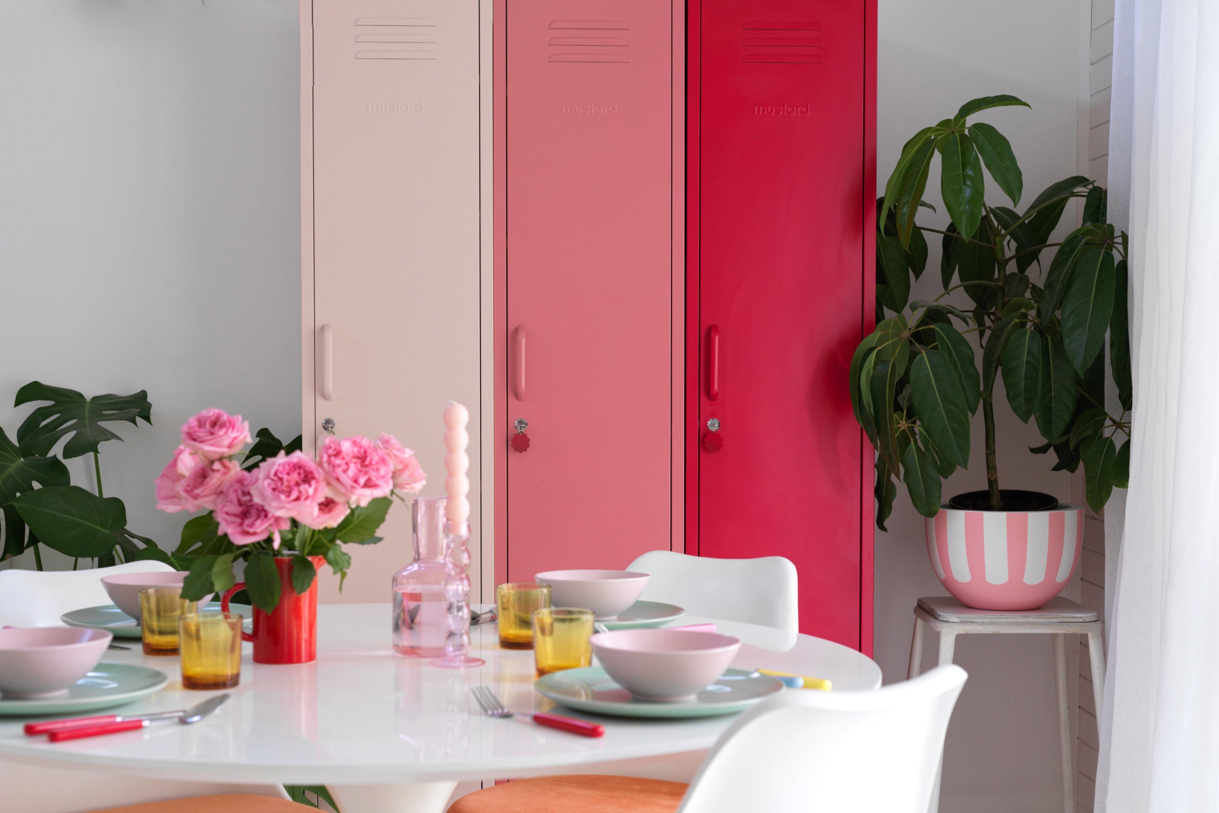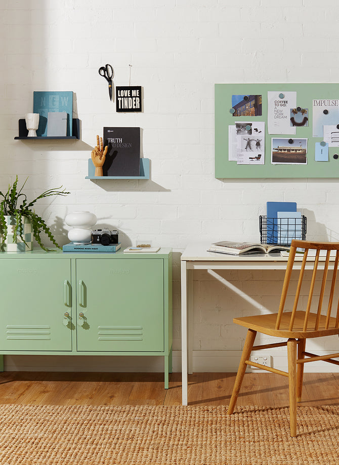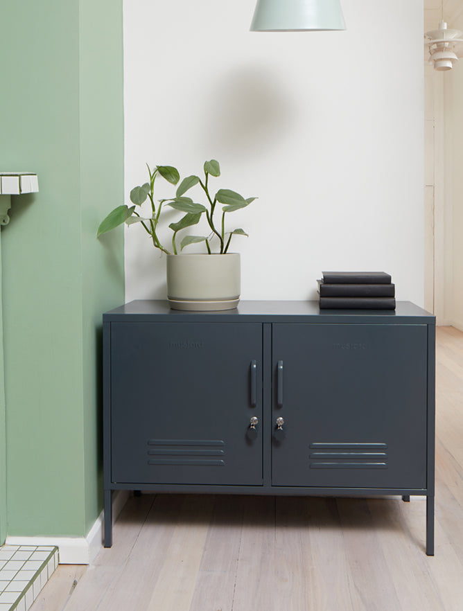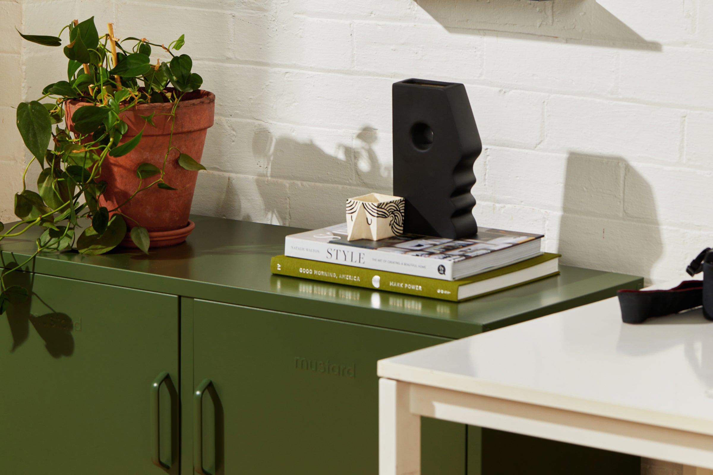 Comment faire : optez pour une Mustard dans une teinte neutre, ajoutez quelques petits objets décoratifs aux tons contrastés, puis complétez le tout avec des plantes aux formes sculpturales.