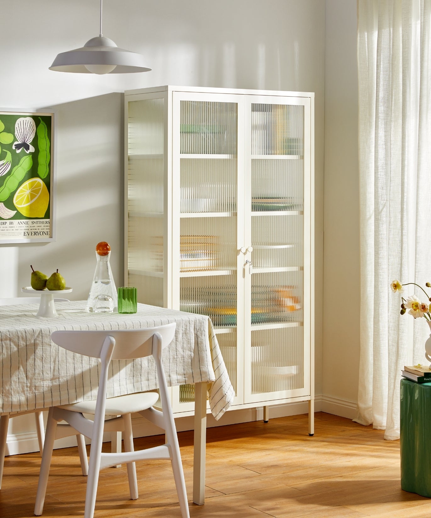 À l'intérieur, vous trouverez quatre étagères réglables, un verrou de porte et un subtil gaufrage "moutarde", pour vous faire comprendre qu'il s'agit d'une véritable affaire. À l'extérieur, des panneaux de verre cannelé sont placés dans un cadre métallique avec des poignées en médaillon, une serrure, un porte-clés personnalisé en émail Mustard et des pieds réglables. Les écrans ne rendent pas toujours justice à nos couleurs - commandez un échantillon pour voir ce que cela donne dans votre espace.