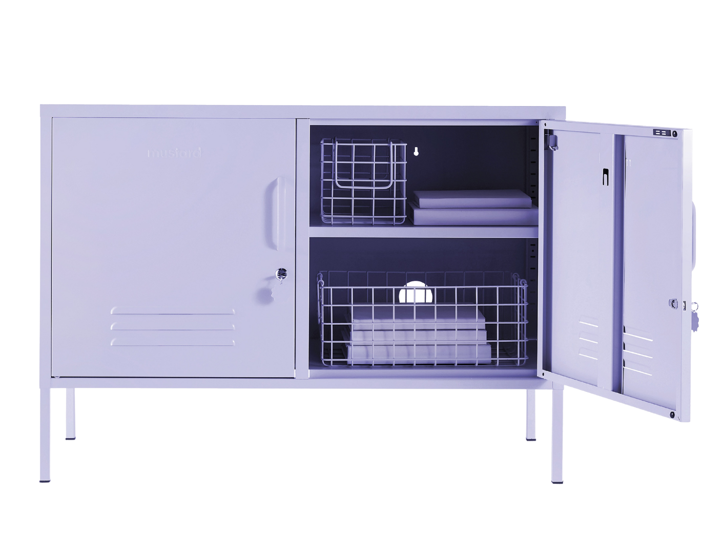 À l'intérieur, vous trouverez deux étagères réglables et un crochet pratique à l'intérieur de chaque porte. À l'extérieur, vous trouverez des poignées, des serrures, des porte-clés personnalisés, des bouches d'aération, deux trous pour les câbles, des points de fixation murale et un subtil gaufrage "moutarde" sur chaque porte, pour que vous sachiez qu'il s'agit d'une véritable affaire. De plus, l'ensemble du casier est lisse, mat et magnétique ! Les écrans ne rendent pas toujours justice à nos couleurs - commandez un échantillon pour voir ce que cela donne dans votre espace.