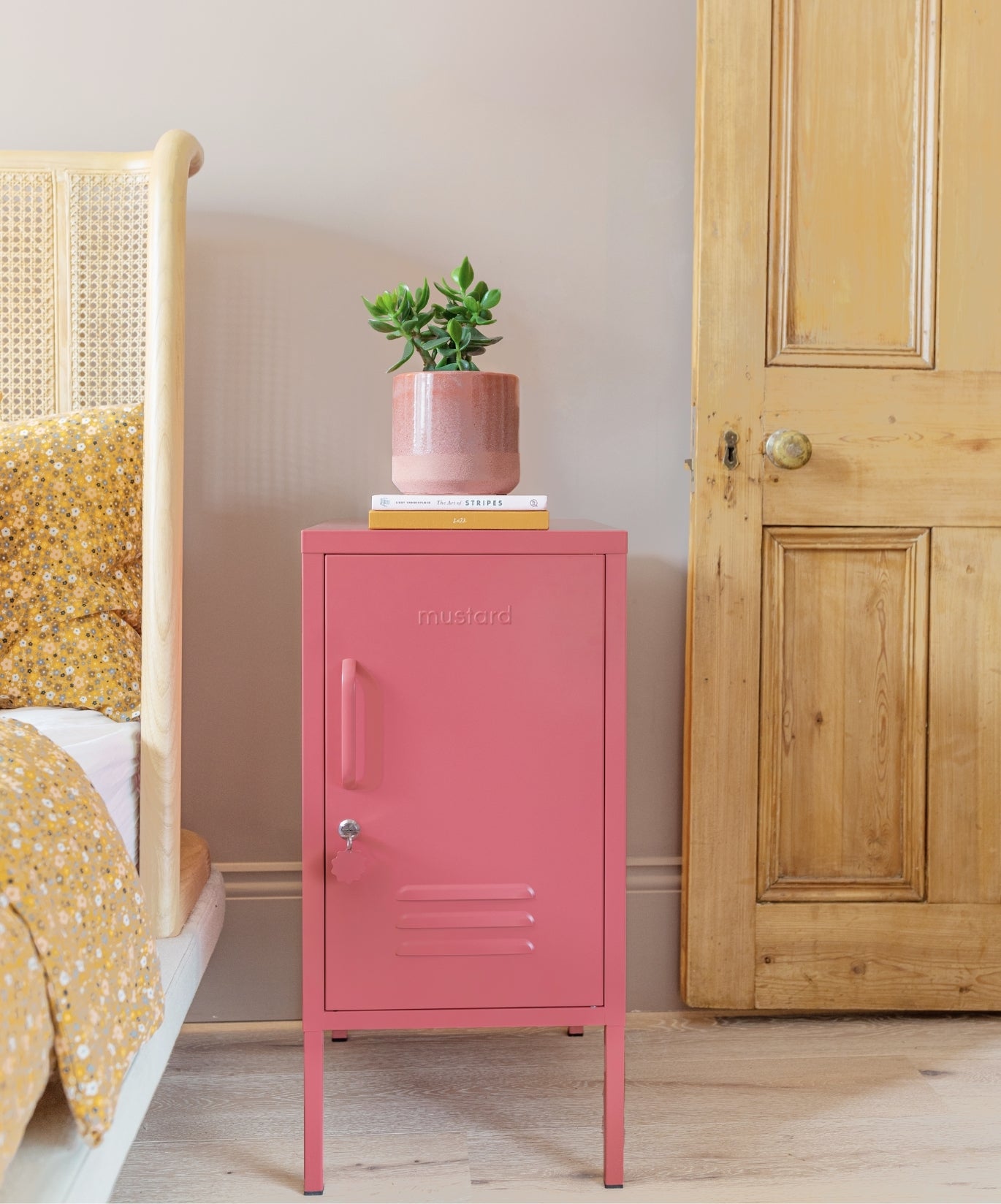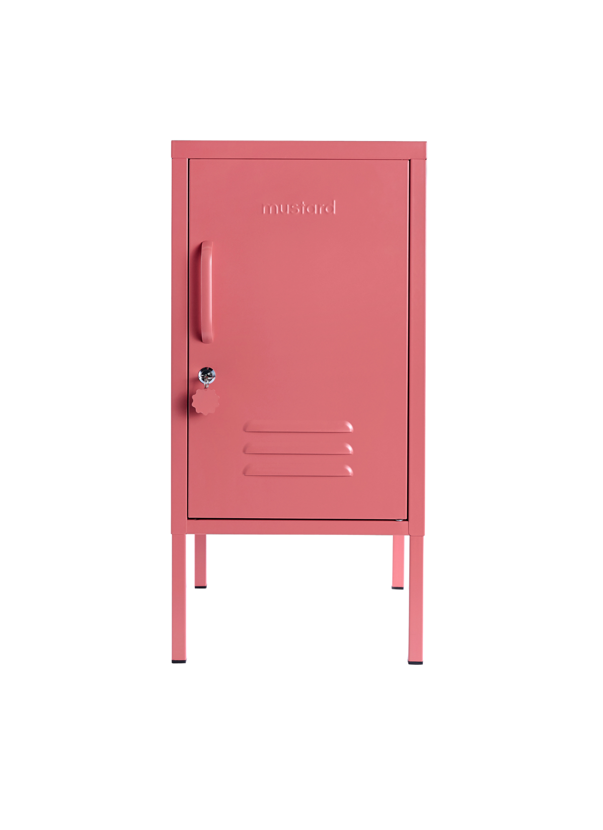 L'intérieur comporte deux étagères réglables et un crochet pratique. À l'extérieur, vous trouverez une poignée, une serrure, un porte-clés personnalisé, des bouches d'aération et une "moutarde" subtilement embossée, pour que vous sachiez qu'il s'agit d'une véritable affaire. La porte s'ouvre à droite ! De plus, l'ensemble du casier est lisse, mat et magnétique. Les écrans ne rendent pas toujours justice à nos couleurs - commandez un échantillon pour voir ce que cela donne dans votre espace.
