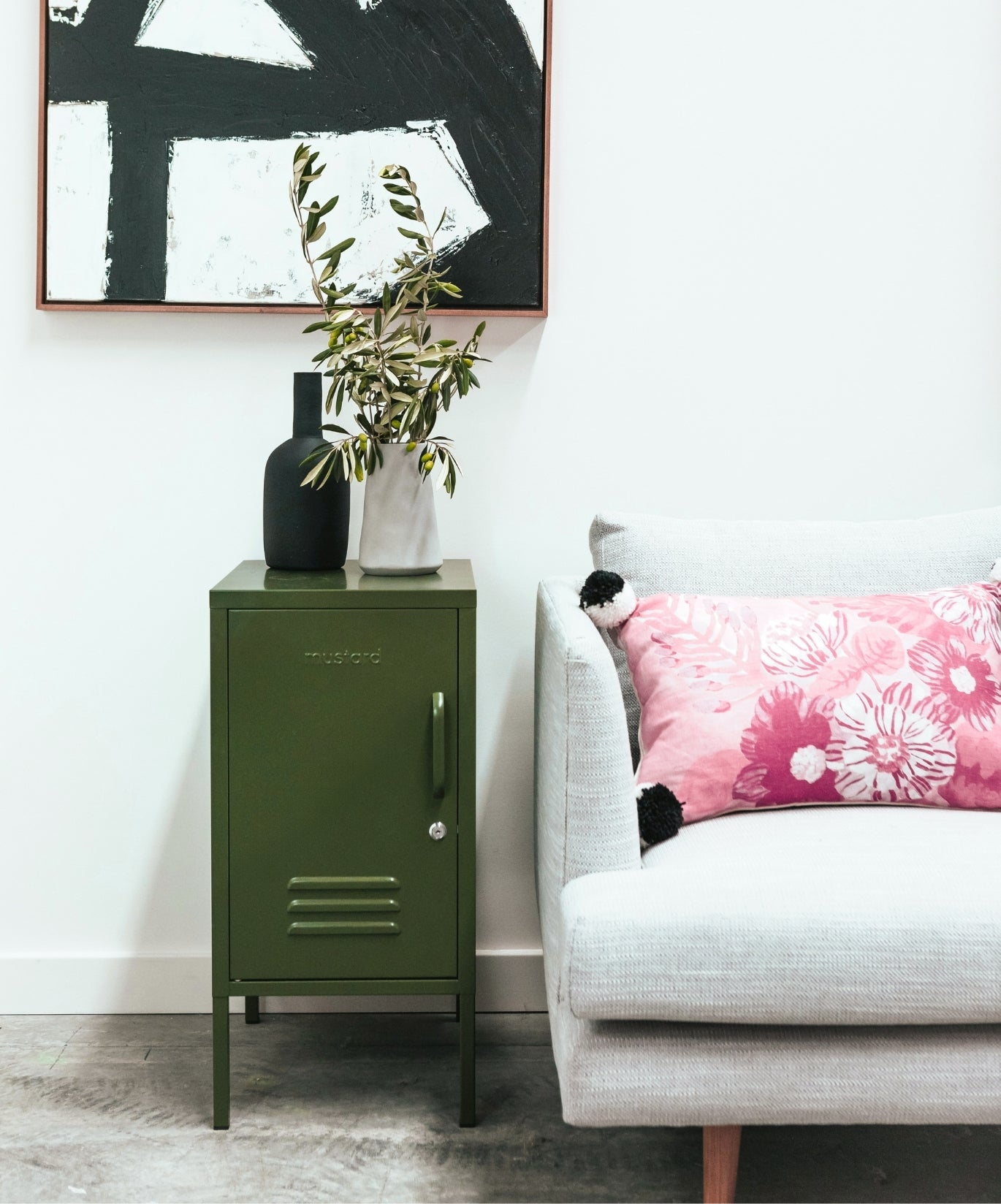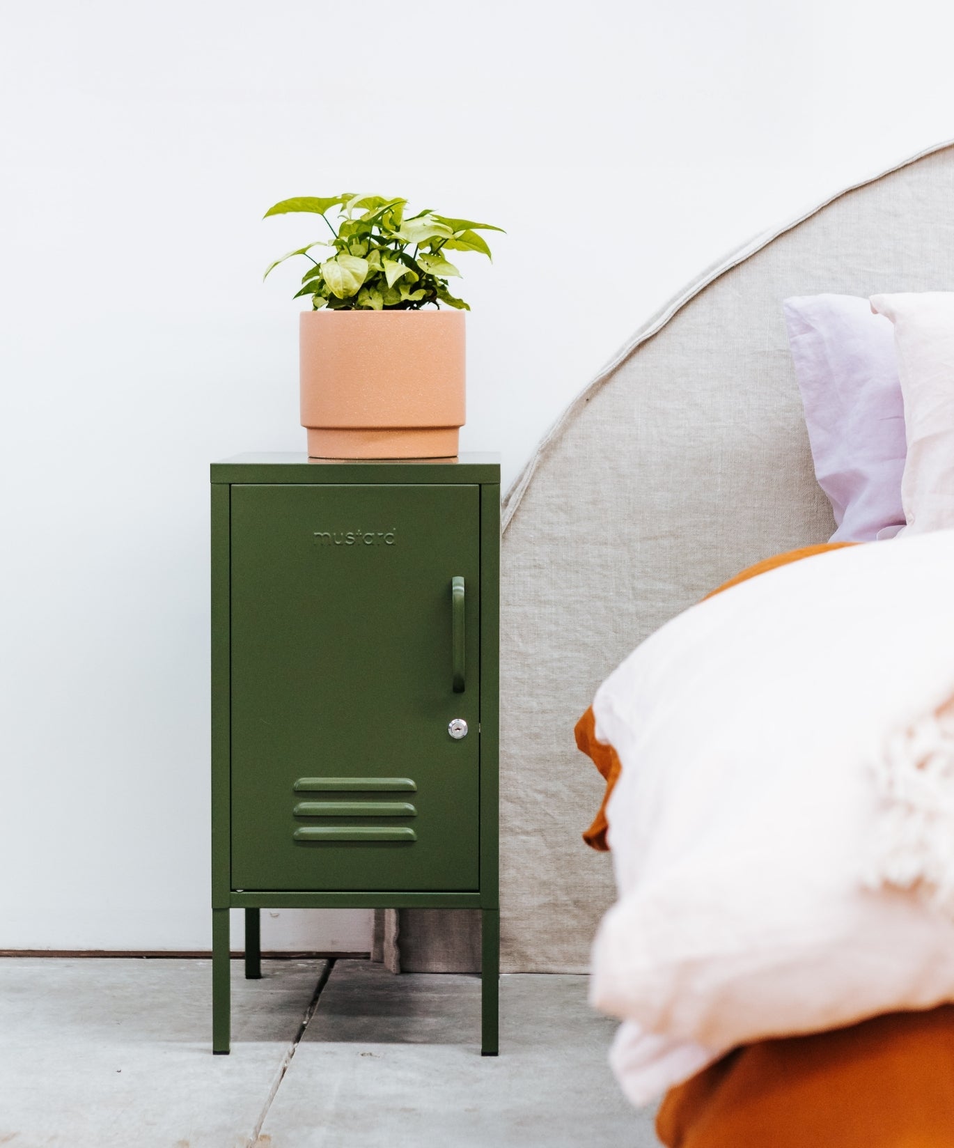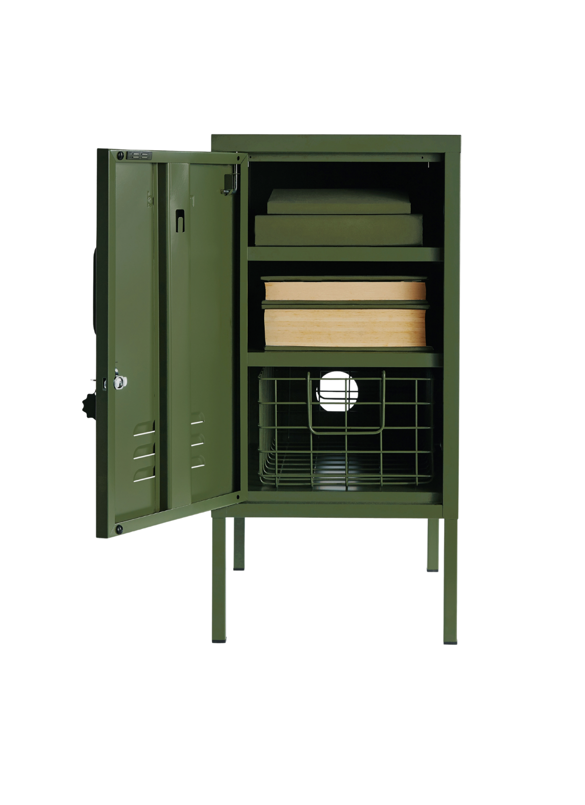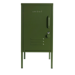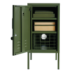 L'intérieur comporte deux étagères réglables et un crochet pratique. À l'extérieur, vous trouverez une poignée, une serrure, un porte-clés personnalisé, des bouches d'aération et une "moutarde" subtilement embossée, pour vous indiquer qu'il s'agit d'une véritable affaire. La porte s'ouvre à gauche ! De plus, l'ensemble du casier est lisse, mat et magnétique. Les écrans ne rendent pas toujours justice à nos couleurs - commandez un échantillon pour voir ce que cela donne dans votre espace.
