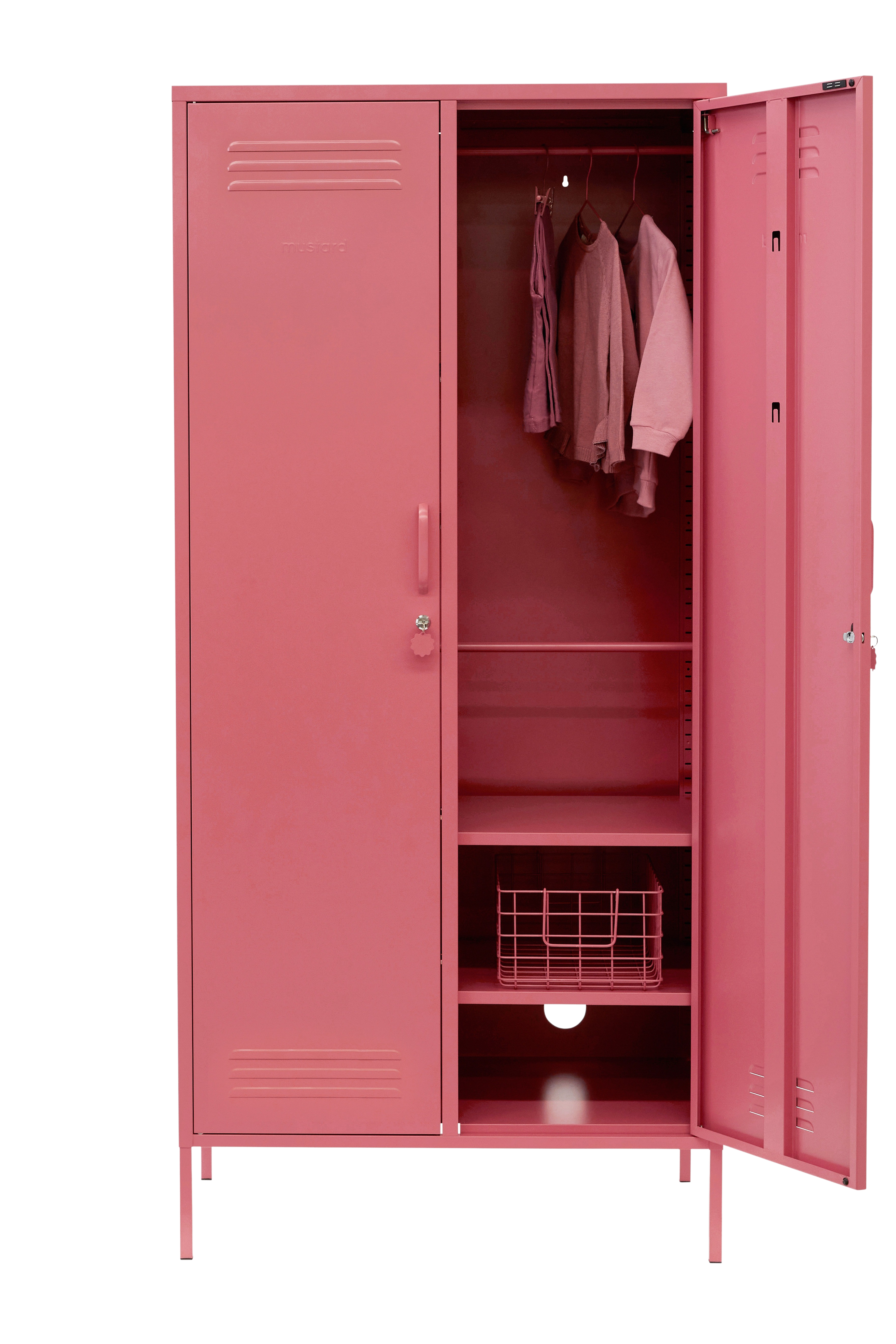 À l'intérieur, vous trouverez quatre étagères réglables, deux rails de suspension amovibles et deux crochets pratiques à l'intérieur de chaque porte. À l'extérieur, vous trouverez des poignées, des serrures, des porte-clés personnalisés, des bouches d'aération, deux trous pour les câbles, des points de fixation murale et un subtil gaufrage "moutarde" sur chaque porte, pour que vous sachiez qu'il s'agit d'une véritable affaire. De plus, l'ensemble du casier est lisse, mat et magnétique ! Les écrans ne rendent pas toujours justice à nos couleurs - commandez un échantillon pour voir ce que cela donne dans votre espace.