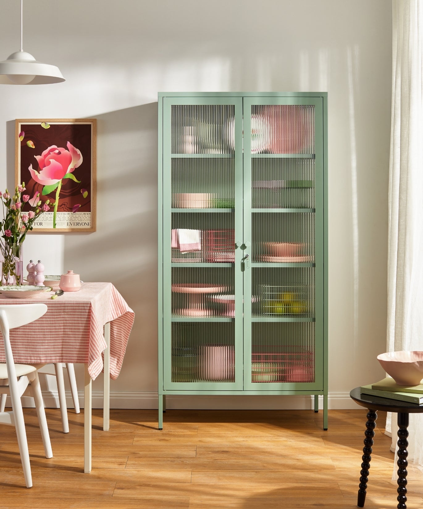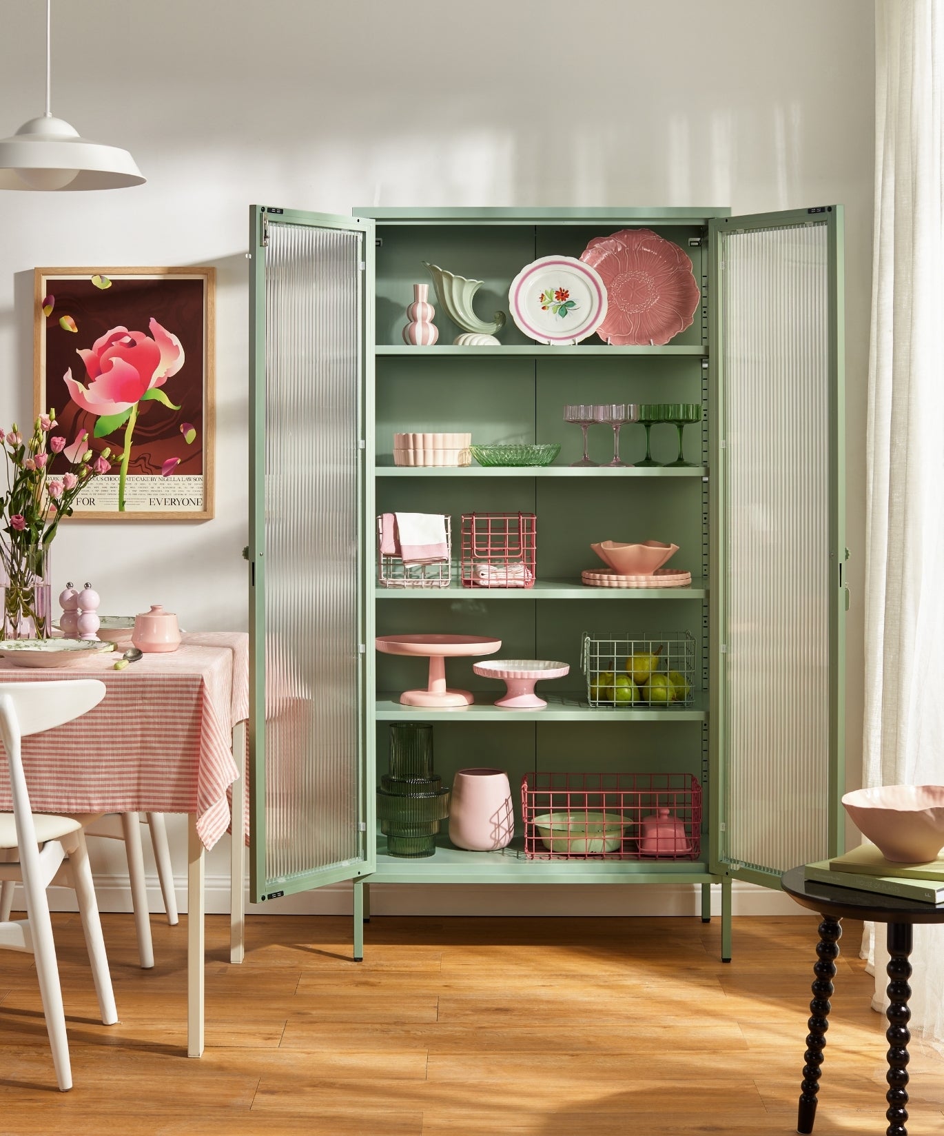 All'interno si trovano quattro ripiani regolabili, un chiavistello e una sottile scritta "mustard" in rilievo, per farvi capire che si tratta di un vero affare. All'esterno, i pannelli in vetro scanalato sono incastonati in una struttura metallica con maniglie a medaglione, una serratura, un portachiavi personalizzato in smalto Mustard e piedini regolabili. Gli schermi non sempre rendono giustizia ai nostri colori: ordinate un campione per vedere come appare nel vostro spazio.