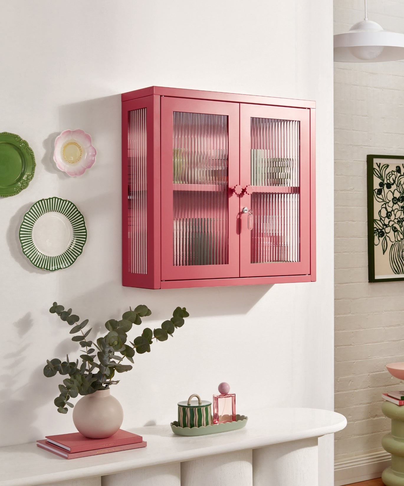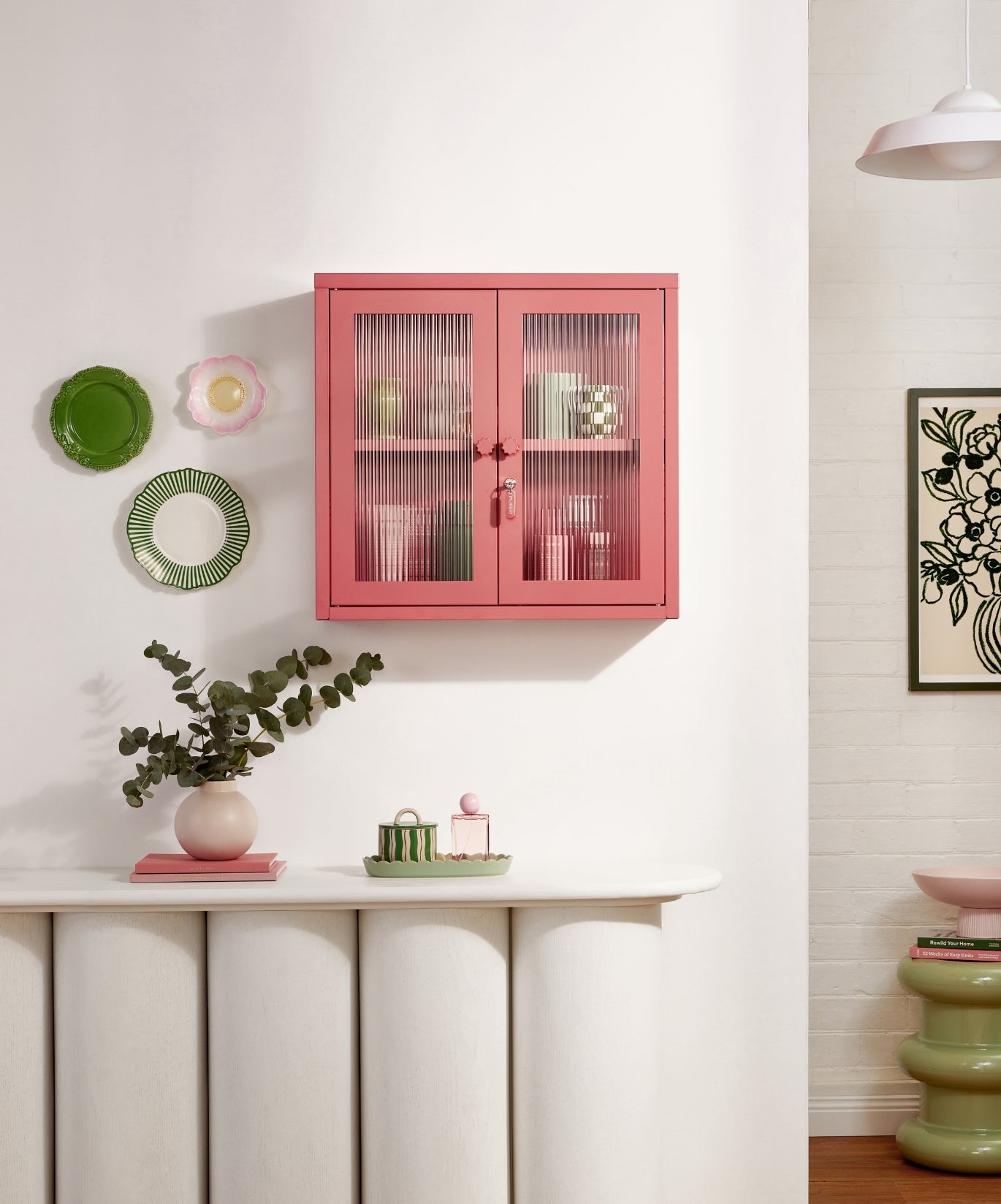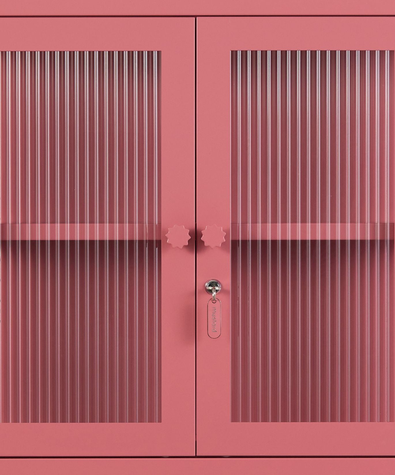 All'interno si trovano un ripiano regolabile, un chiavistello e una sottile scritta "mustard" in rilievo, per farvi capire che si tratta di un vero affare. All'esterno, i pannelli di vetro scanalato sono incastonati in un telaio metallico con maniglie a medaglione, una serratura, un portachiavi personalizzato in smalto Mustard e punti di fissaggio a parete. Gli schermi non sempre rendono giustizia ai nostri colori: ordinate un campione per vedere come appare nel vostro spazio.
