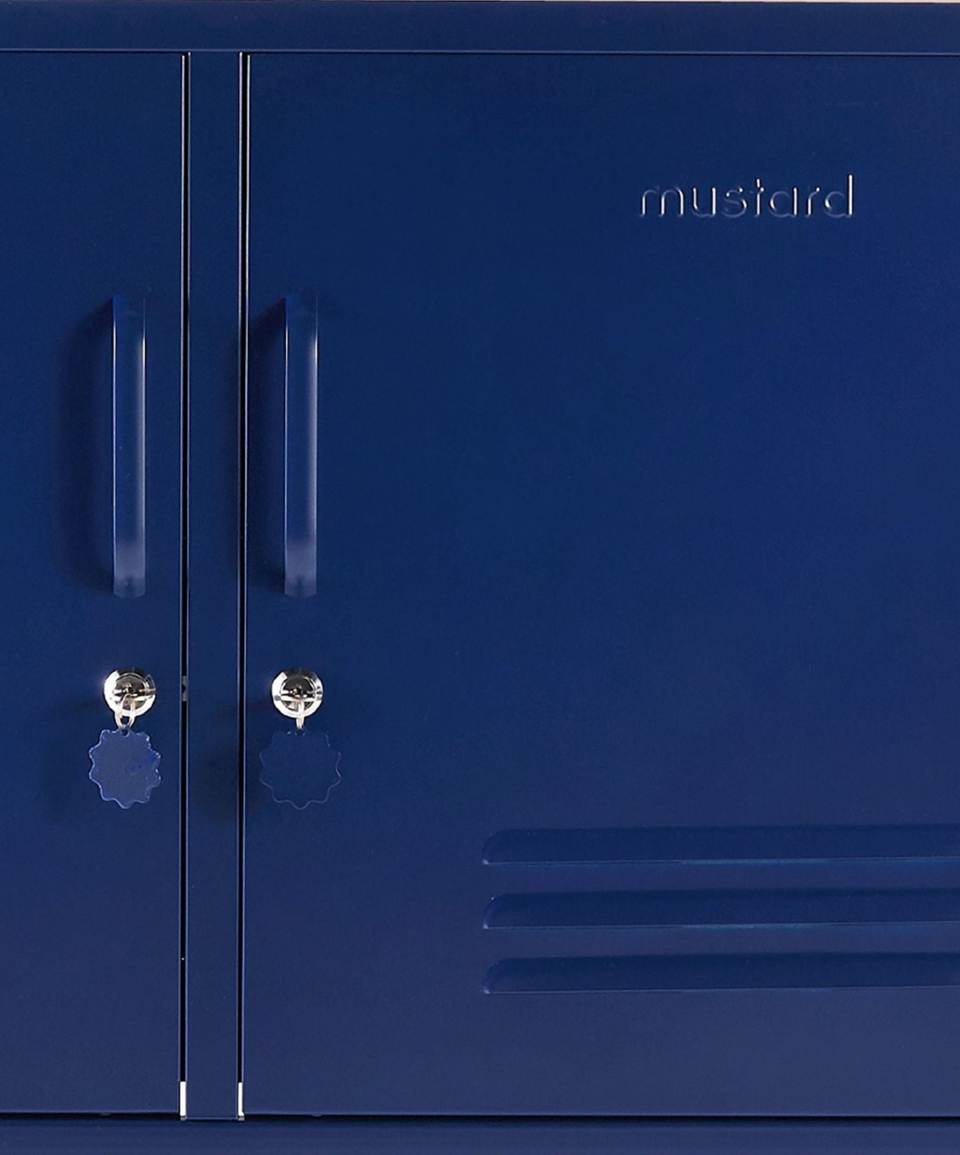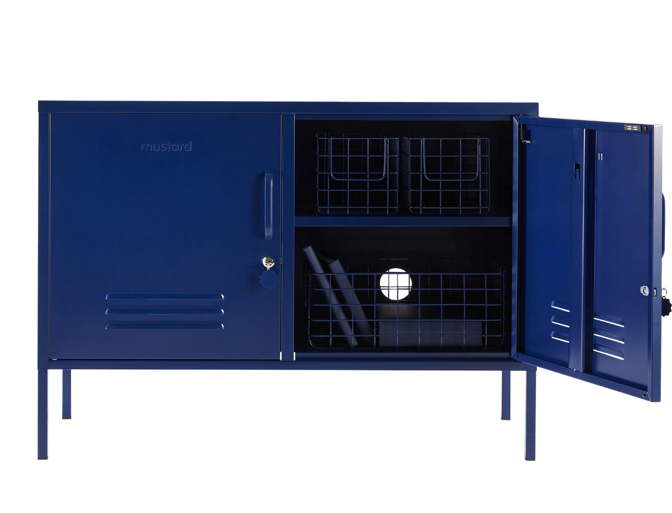 All'interno sono presenti due ripiani regolabili e un pratico gancio all'interno di ogni anta. All'esterno, maniglie, serrature, portachiavi personalizzati, prese d'aria, due fori per i cavi, punti di fissaggio al muro e una sottile scritta "senape" in rilievo su ogni porta, per farvi capire che si tratta di un vero affare. Inoltre, l'intero armadietto è liscio, opaco e magnetico! Gli schermi non sempre rendono giustizia ai nostri colori: ordinate un campione per vedere come appare nel vostro spazio.