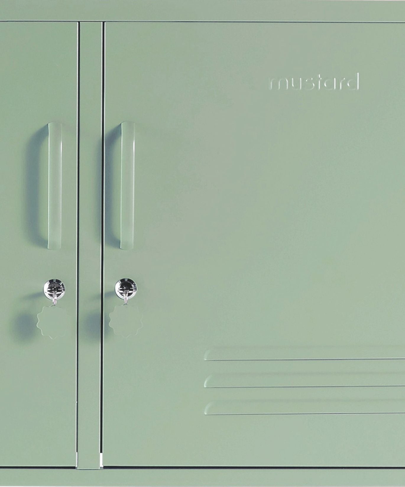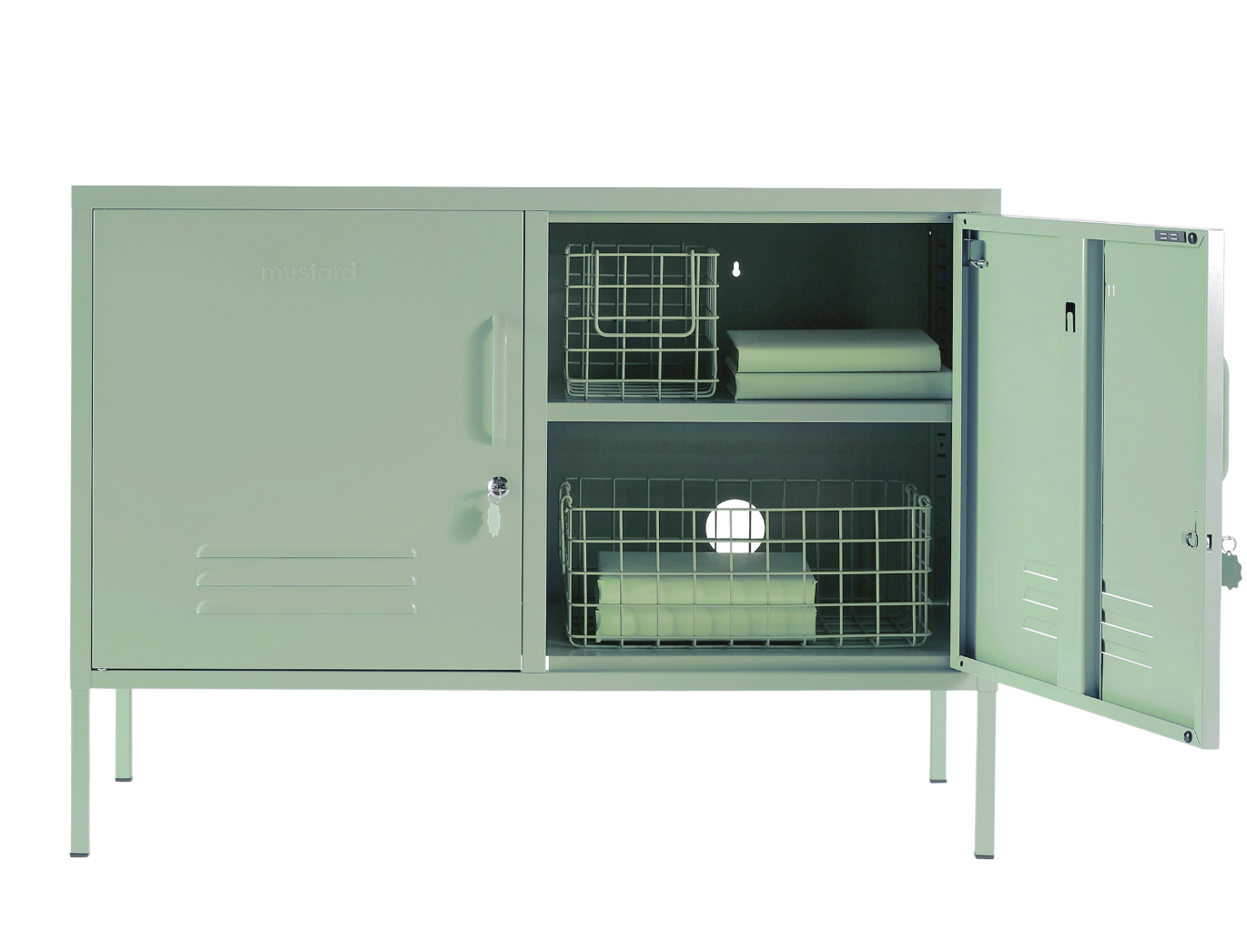 All'interno sono presenti due ripiani regolabili e un pratico gancio all'interno di ogni anta. All'esterno, maniglie, serrature, portachiavi personalizzati, prese d'aria, due fori per i cavi, punti di fissaggio al muro e una sottile scritta "senape" in rilievo su ogni porta, per farvi capire che si tratta di un vero affare. Inoltre, l'intero armadietto è liscio, opaco e magnetico! Gli schermi non sempre rendono giustizia ai nostri colori: ordinate un campione per vedere come appare nel vostro spazio.