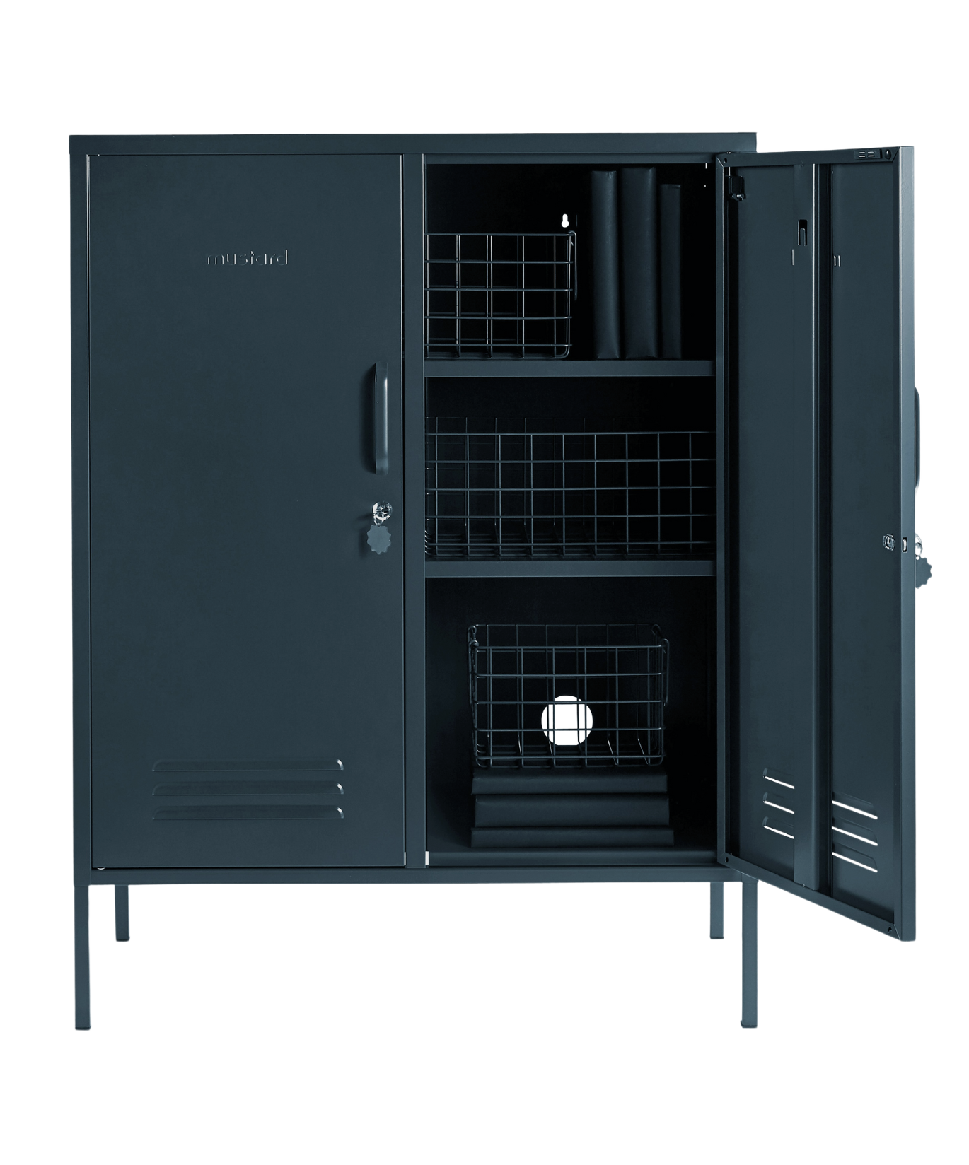 All'interno sono presenti due ripiani regolabili e un pratico gancio all'interno di ogni anta. All'esterno, maniglie, serrature, portachiavi personalizzati, prese d'aria, due fori per i cavi, punti di fissaggio al muro e una sottile scritta "senape" in rilievo su ogni porta, per farvi capire che si tratta di un vero affare. Inoltre, l'intero armadietto è liscio, opaco e magnetico! Gli schermi non sempre rendono giustizia ai nostri colori: ordinate un campione per vedere come appare nel vostro spazio.