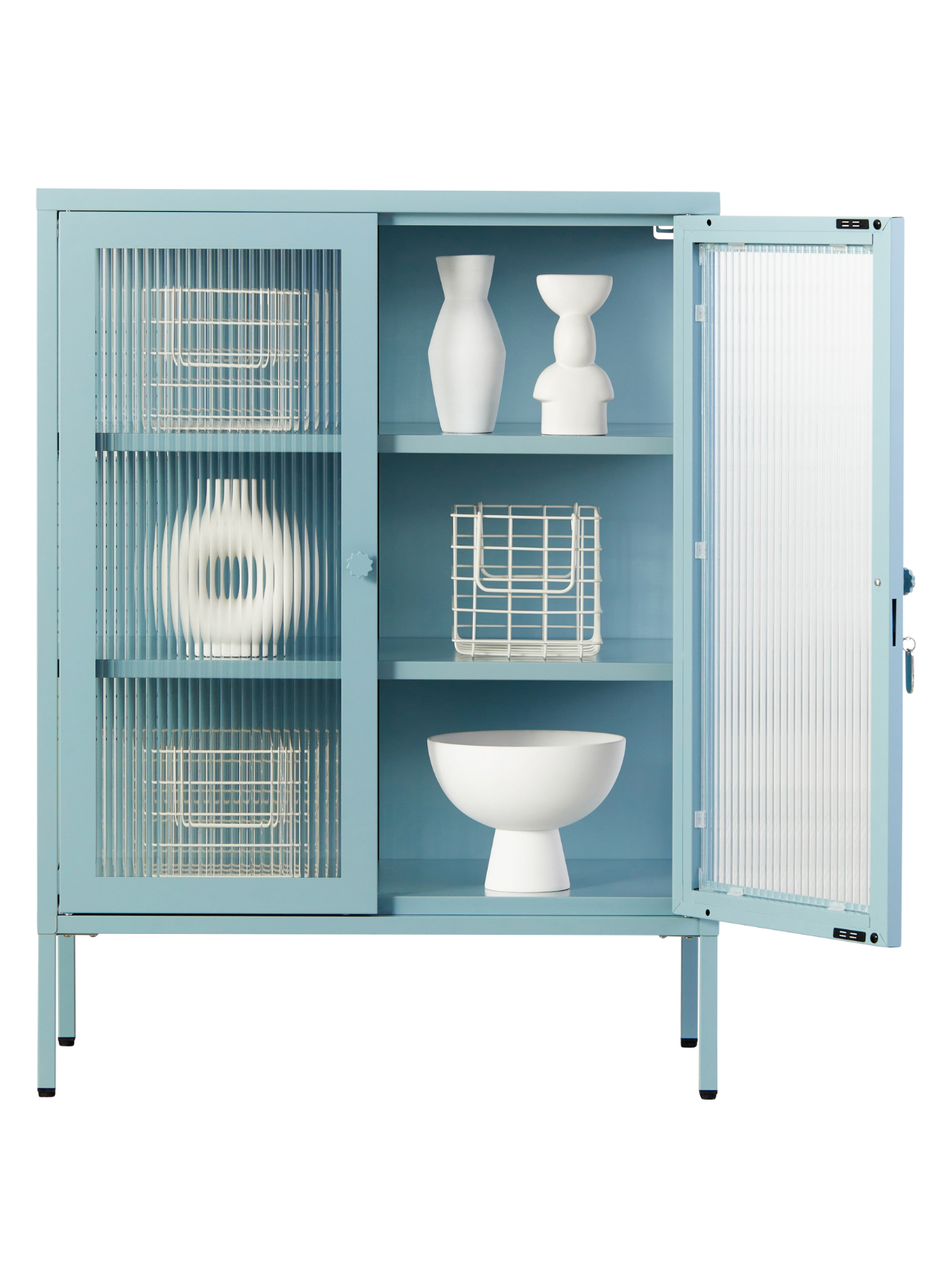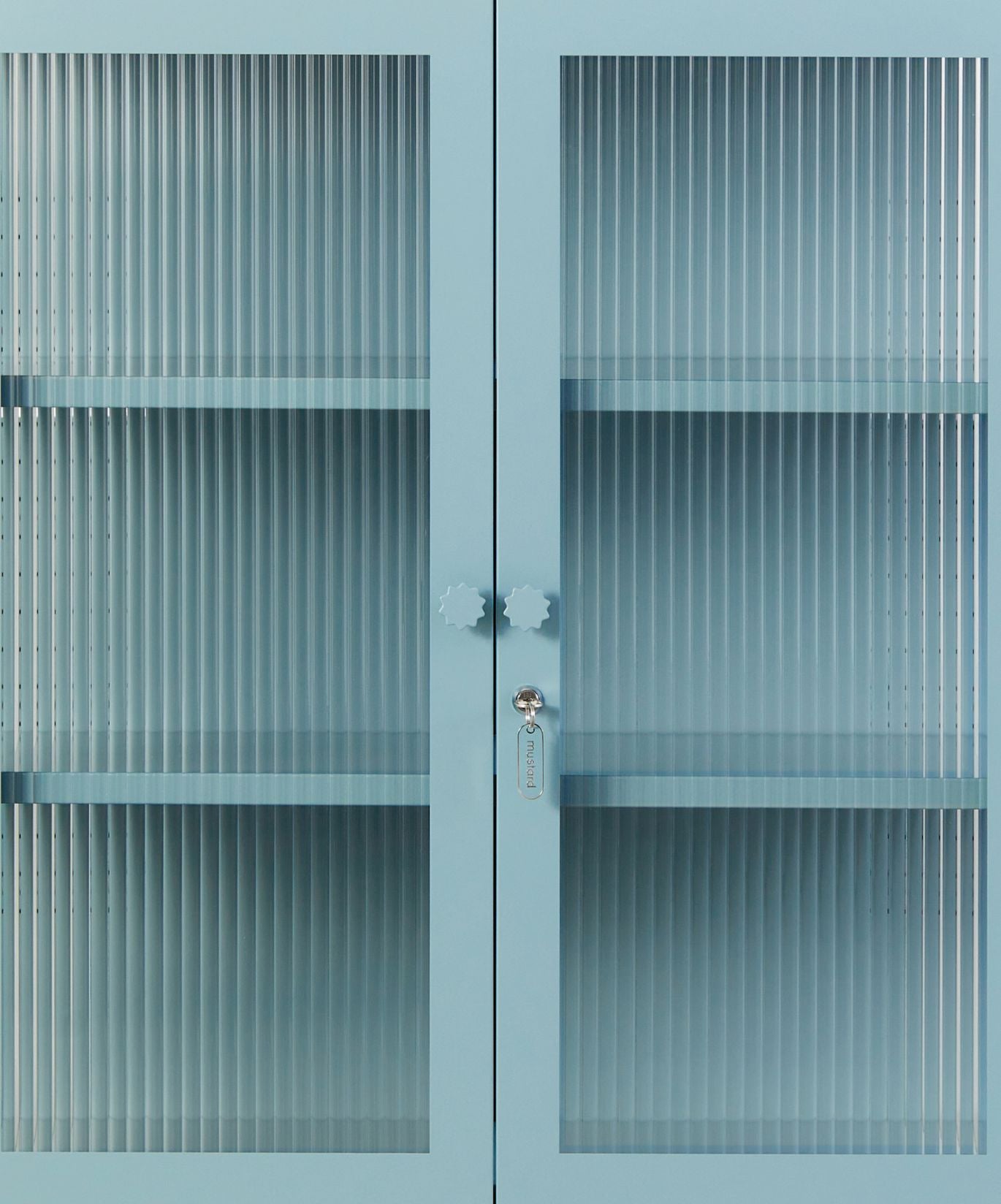 All'interno si trovano due ripiani regolabili, un chiavistello e una sottile scritta "mustard" in rilievo, per farvi capire che si tratta di un vero affare. All'esterno, i pannelli in vetro scanalato sono incastonati in una struttura metallica con maniglie a medaglione, una serratura, un portachiavi personalizzato in smalto Mustard , piedini regolabili e punti di fissaggio a parete. Gli schermi non sempre rendono giustizia ai nostri colori: ordinate un campione per vedere come sta nel vostro spazio.