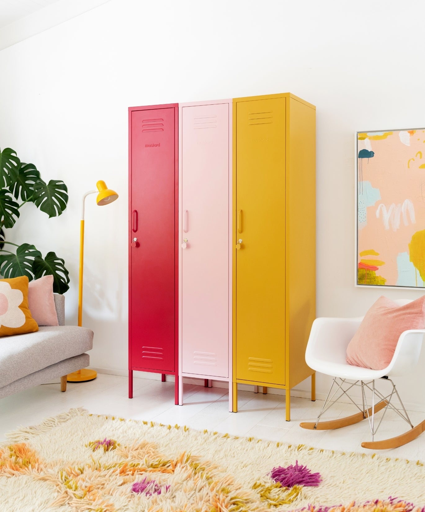 All'interno, troverete un appendino rimovibile, quattro ripiani regolabili e due comodi ganci. All'esterno sono presenti una maniglia, una serratura, un portachiavi personalizzato, prese d'aria e una sottile scritta "senape" in rilievo, per farvi capire che si tratta di un vero affare. Inoltre, l'intero armadietto è liscio, opaco e magnetico! Gli schermi non sempre rendono giustizia ai nostri colori: ordinate un campione per vedere come appare nel vostro spazio.