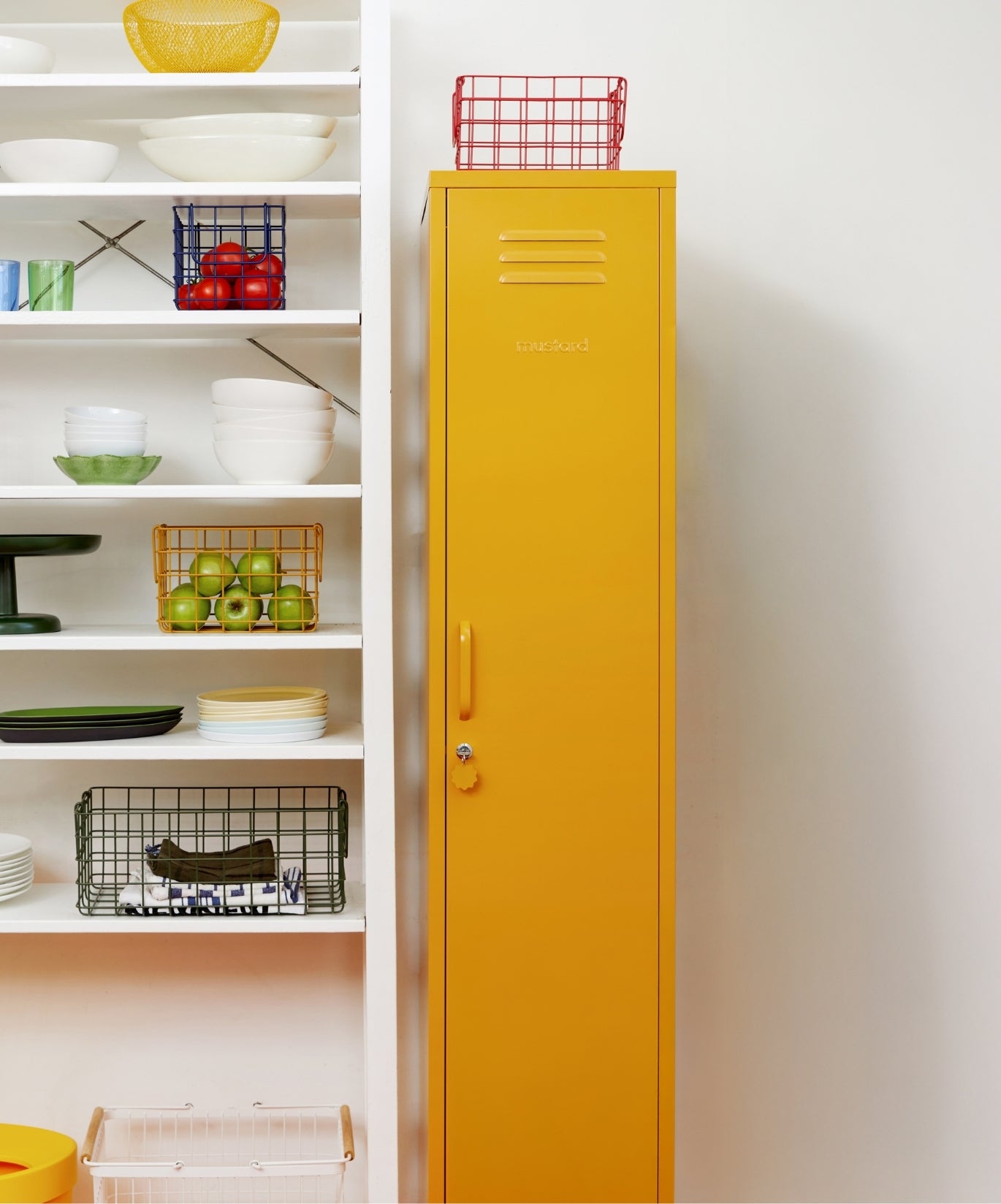 All'interno, troverete un appendino rimovibile, quattro ripiani regolabili e due comodi ganci. All'esterno sono presenti una maniglia, una serratura, un portachiavi personalizzato, prese d'aria e una sottile scritta "senape" in rilievo, per farvi capire che si tratta di un vero affare. Inoltre, l'intero armadietto è liscio, opaco e magnetico! Gli schermi non sempre rendono giustizia ai nostri colori: ordinate un campione per vedere come appare nel vostro spazio.
