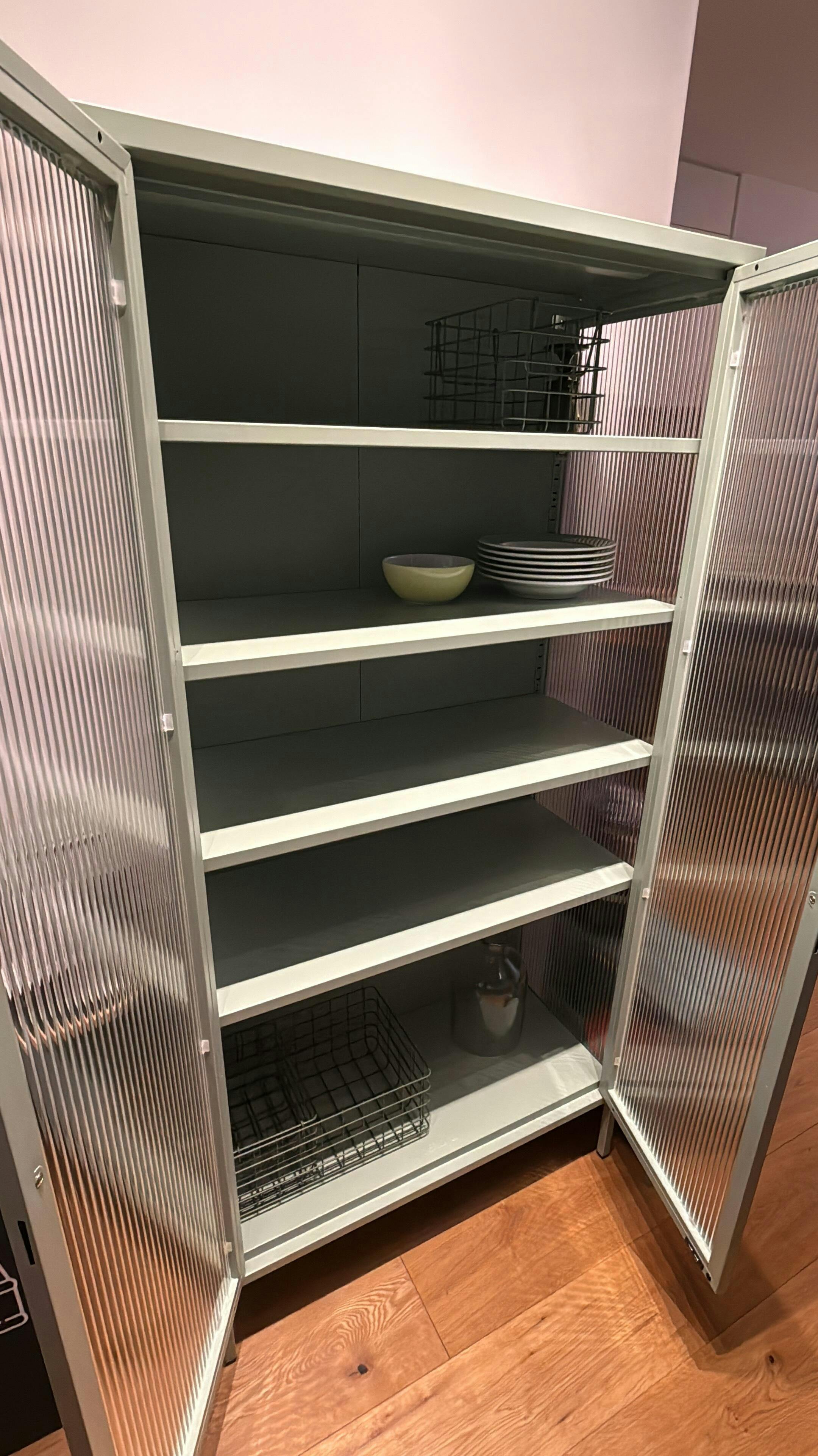 Inside, you'll find four adjustable shelves, a door bolt and a subtle embossed 'mustard', to let you know it's the real deal. Outside, fluted glass panels are set in a metal frame with medallion handles, a lock, a custom Mustard enamel keyring and adjustable feet. Screens don't always do our colours justice — order a swatch to see how it looks in your space.